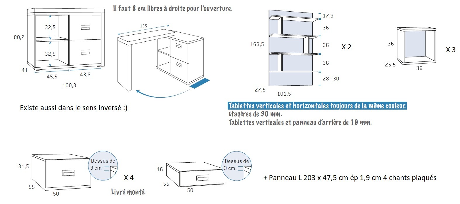 - Un bureau pivotant à 90°, avec son module de rangement 2 niches et 2 coffres