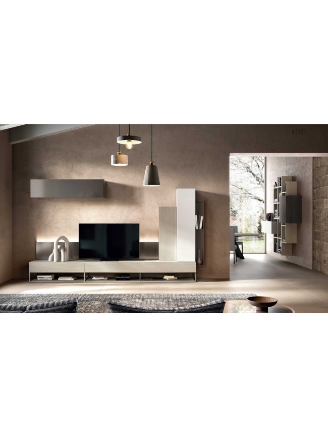 Bibliothèque suspendue moderne et asymétrique au design italien PERSONNALISABLE KC107 allie différentes textures pour un effet chic