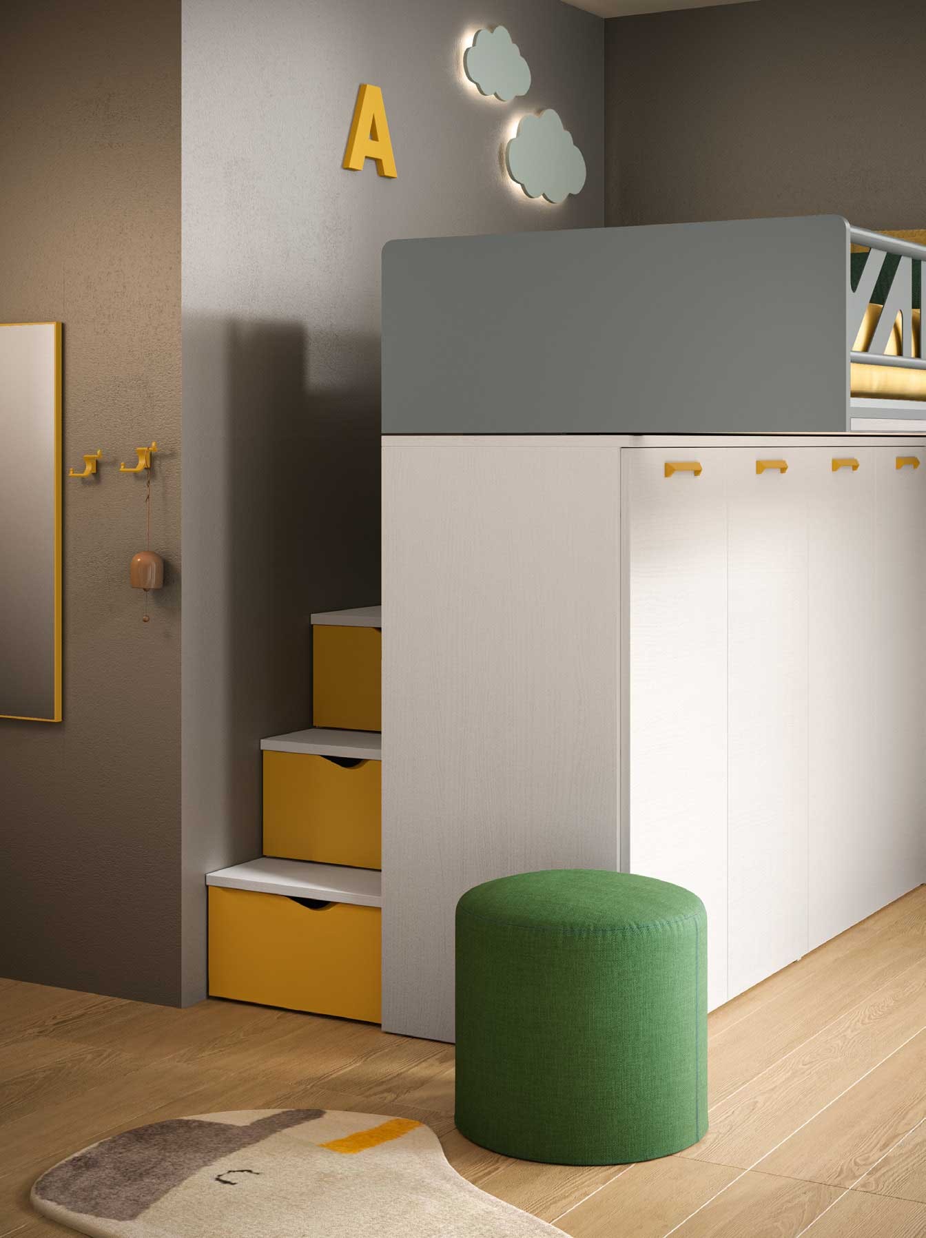 Lit mezzanine coulissant enfant avec escalier et passerelle d’accès - Chambre enfant PERSONNALISABLE K109 - MORETTI COMPACT