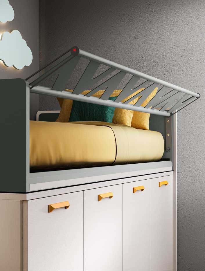 Ce lit mezzanine coulissant pour enfant se distingue par son concept innovant : le couchage se déplace pour libérer l’accès à une passerelle sécurisée, accessible par un escalier. Une solution originale et pratique, pensée pour la sécurité, le confort et l’optimisation de l’espace.