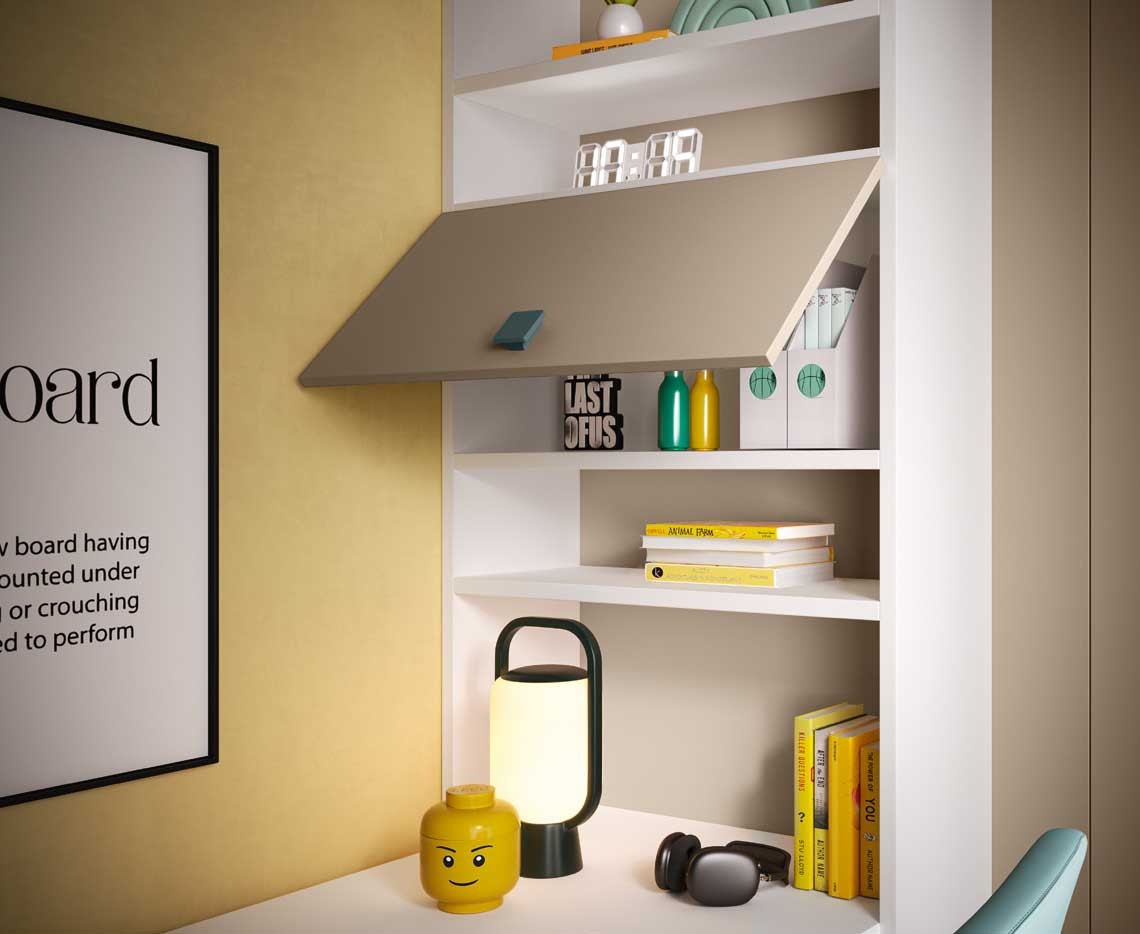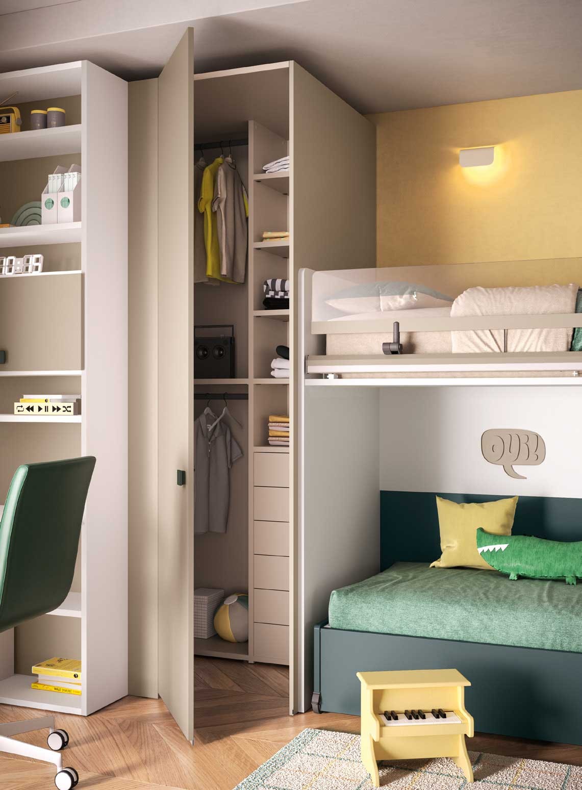 Ce lit superposé multifonction a été conçu comme une véritable solution tout-en-un pour la chambre enfant. Doté de deux grands coffres de rangement, d’une échelle amovible, d’un lit bas au look canapé, d’un bureau intégré et d’une grande armoire d’angle, il optimise l’espace tout en offrant confort, praticité et design.