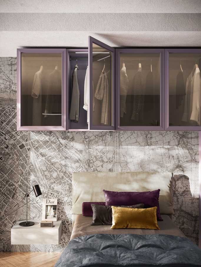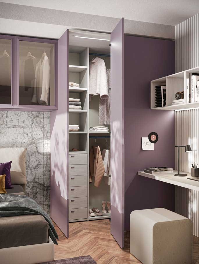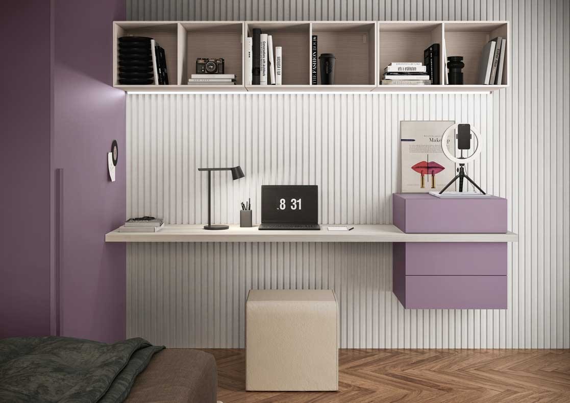 Cette chambre ado contemporaine associe un lit tapissé confortable, un dressing d’angle fonctionnel, un bureau suspendu et un meuble pont vitré pour créer un espace à la fois élégant, organisé et moderne. Les coloris doux mûre et sable apportent une ambiance apaisante et raffinée, idéale pour accompagner l’adolescent au quotidien.