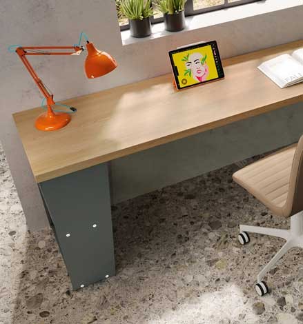 Equipée d'un grand bureau et d'une bibliothèque aux lignes épurées, la chambre peut convenir pour un ado ou un enfant.