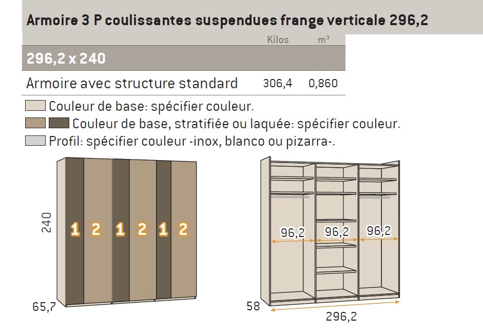 | Dimensions de l'ensemble | Dimensions de l'armoire porte coulissante sur la photo : L 296,2 cm P 65,7 cm H 240 cm |
