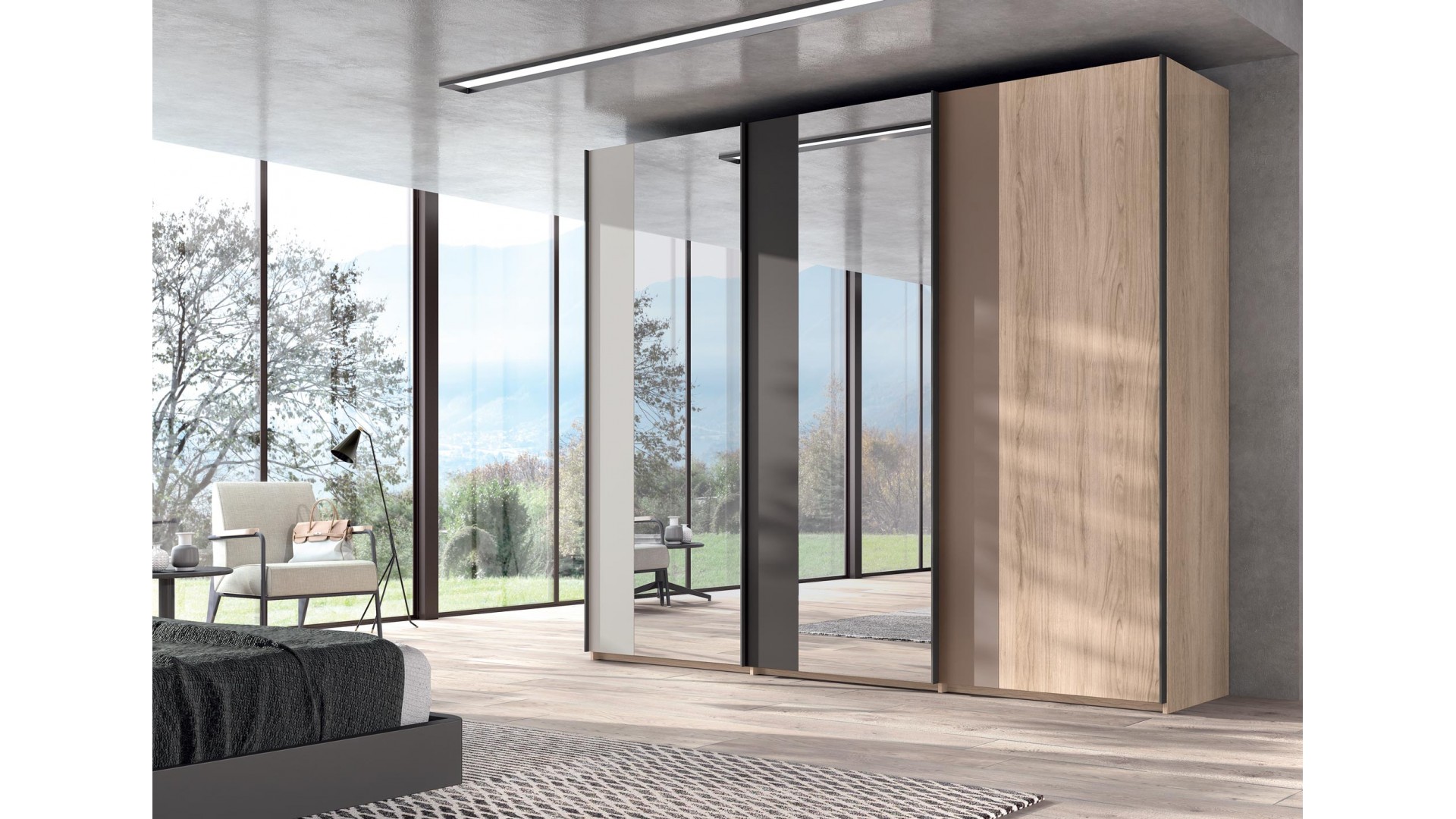 présentée avec façades en coloris Habana + bandes en laque satinée grise, basalto et pizarra avec profils en laque pizarra et structure coloris Habana L'armoire dressing est équipée d'un plancher avec plinthe, d'un fond et d'un plafond.
