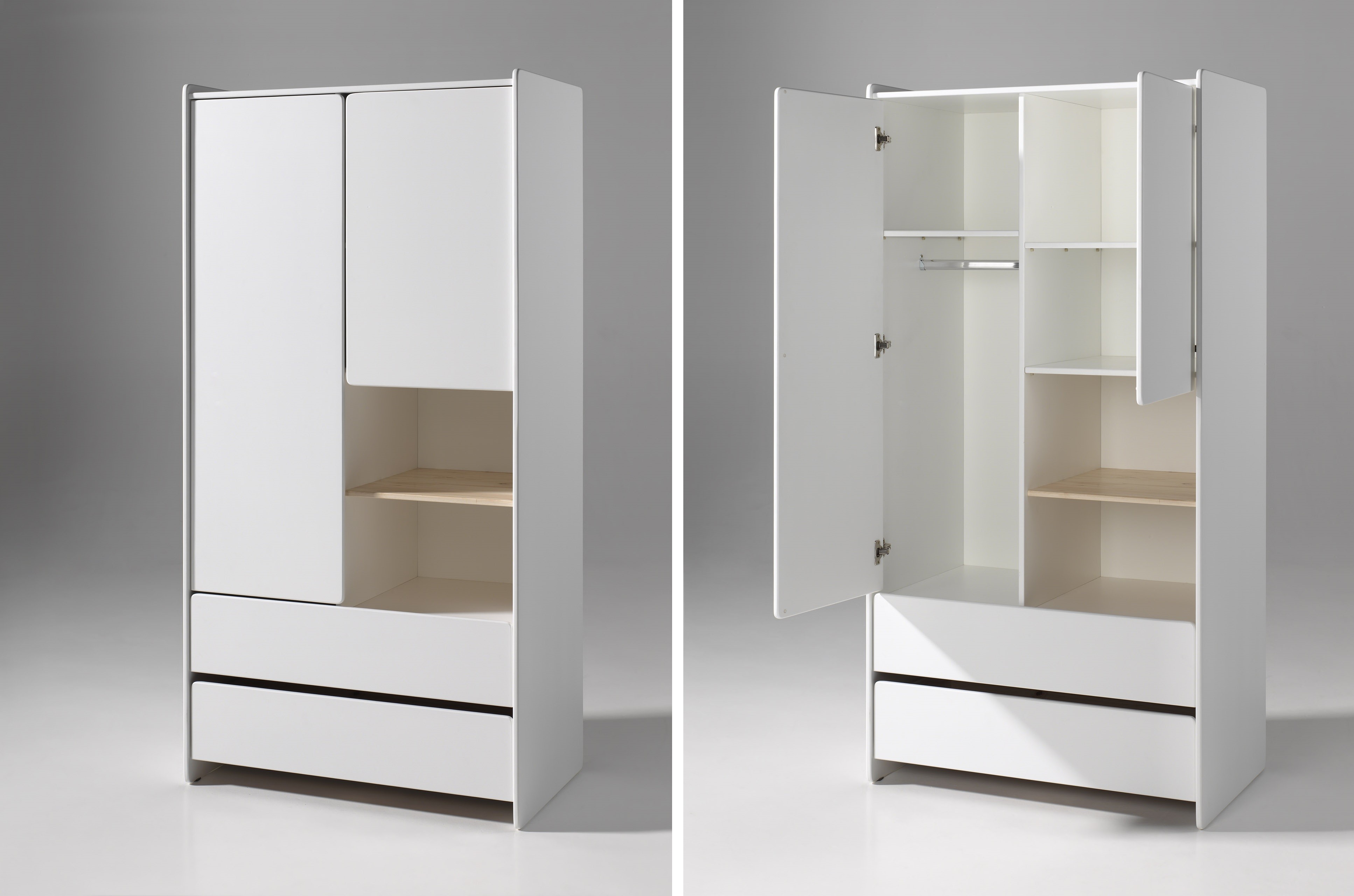 l'armoire assortie L 90 P 55 H 180 cm en PIN de Scandinavie et MDF avec laque blanche anti-UV (non jaunissante) composée de 2 portes, 2 niches et 2 tiroirs ref KIKL2214 |