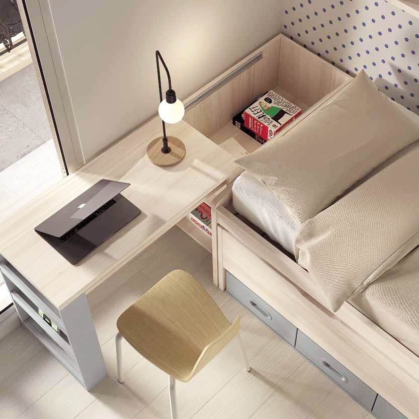 - Un lit bas avec couchage 90 x 190 cm composé de 4 tiroirs avec fermeture amortie, d'un lit gigogne avec couchage de 90 x 180 cm
