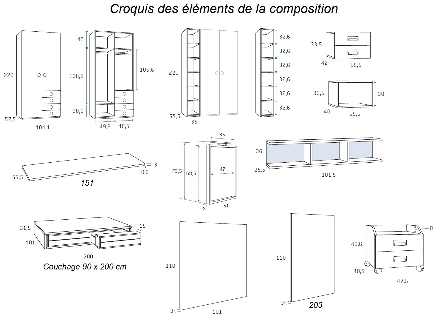 - compléter la chambre proposée avec d’autres meubles de la collection (ex : commode, une armoire, etc…) sur demande : Faire une demande