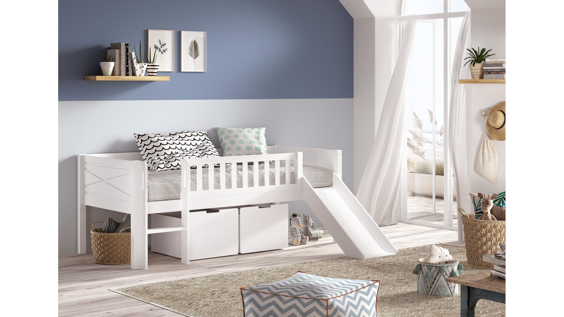 et livré avec un sommier à lattes en bois et un toboggan fabriqué en MDF laqué.