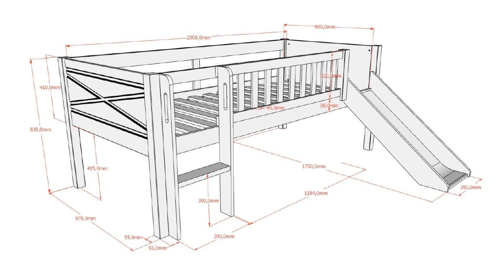 | Matériaux | 100 % PIN laqué mat avec une peinture sans solvants et anti-UV (non jaunissante) et MDF pour le toboggan |