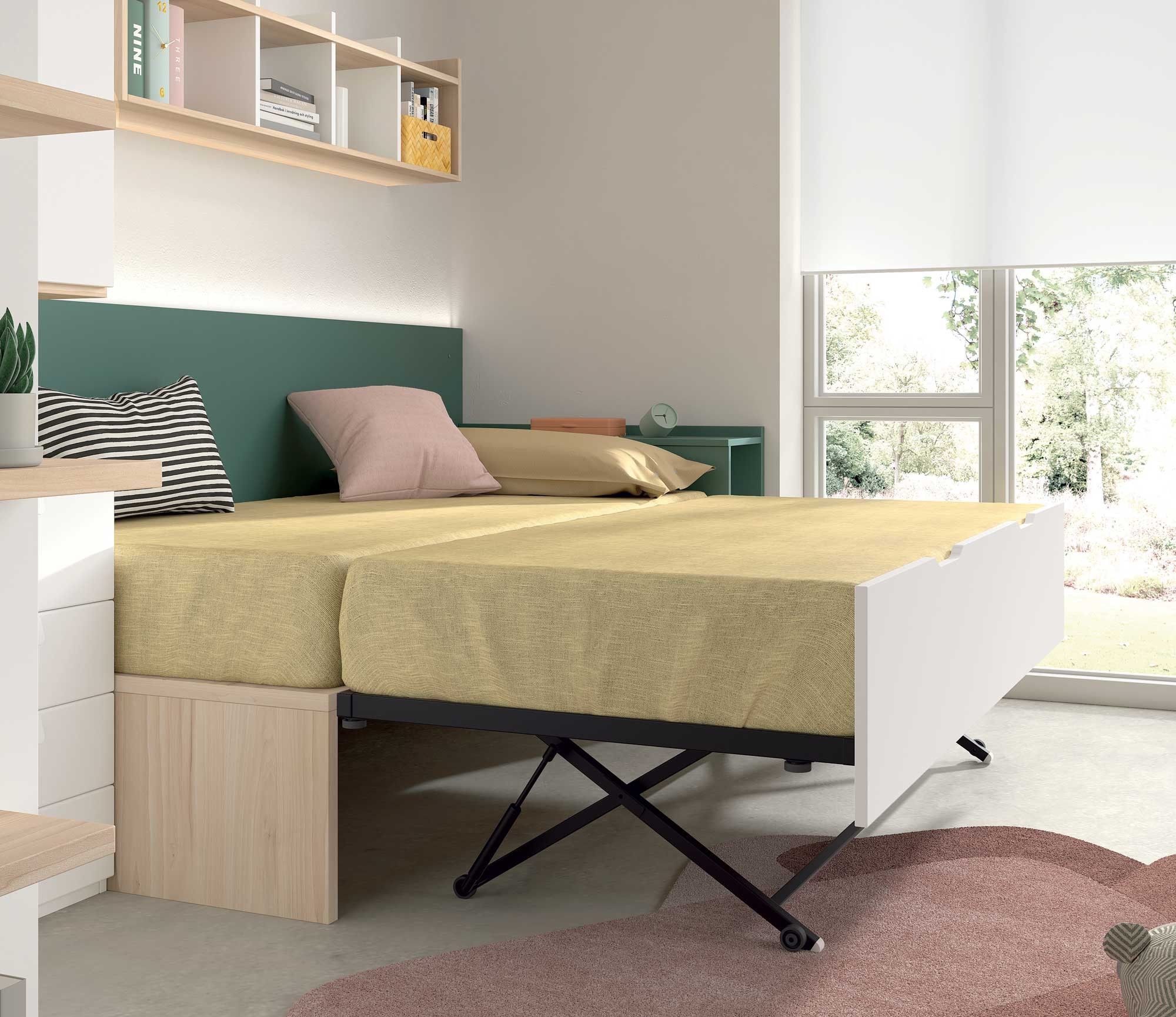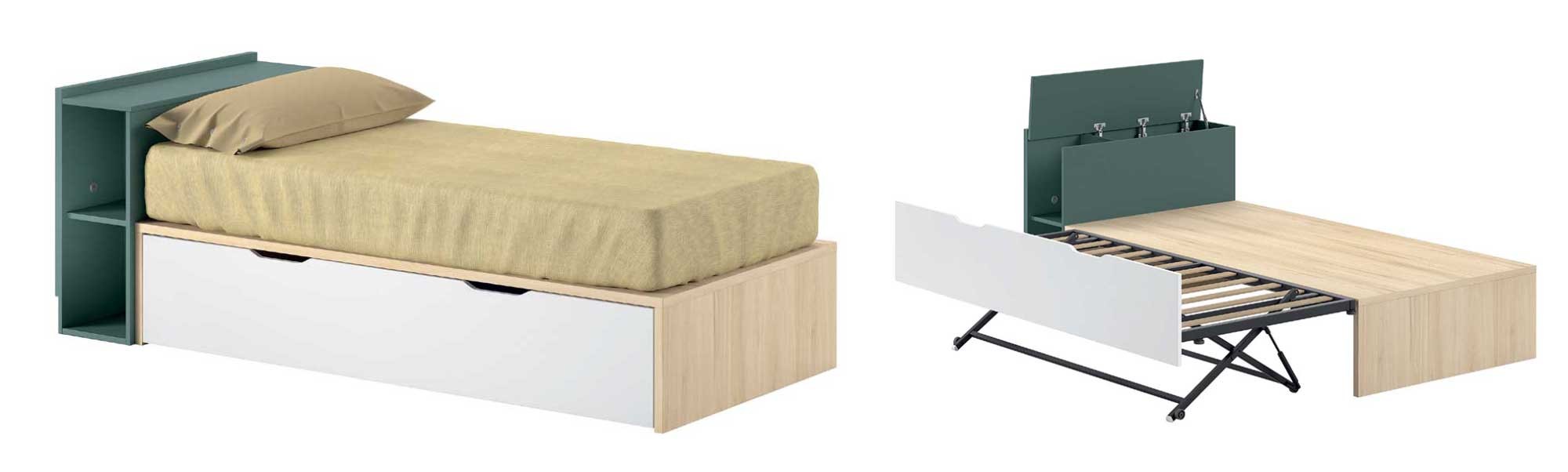 avec lit gigogne avec sommier à lattes en bois qui se relève à la même hauteur que le lit principal / couchage 90 x 190 cm (hauteur utile pour matelas du lit gigogne 21cm).