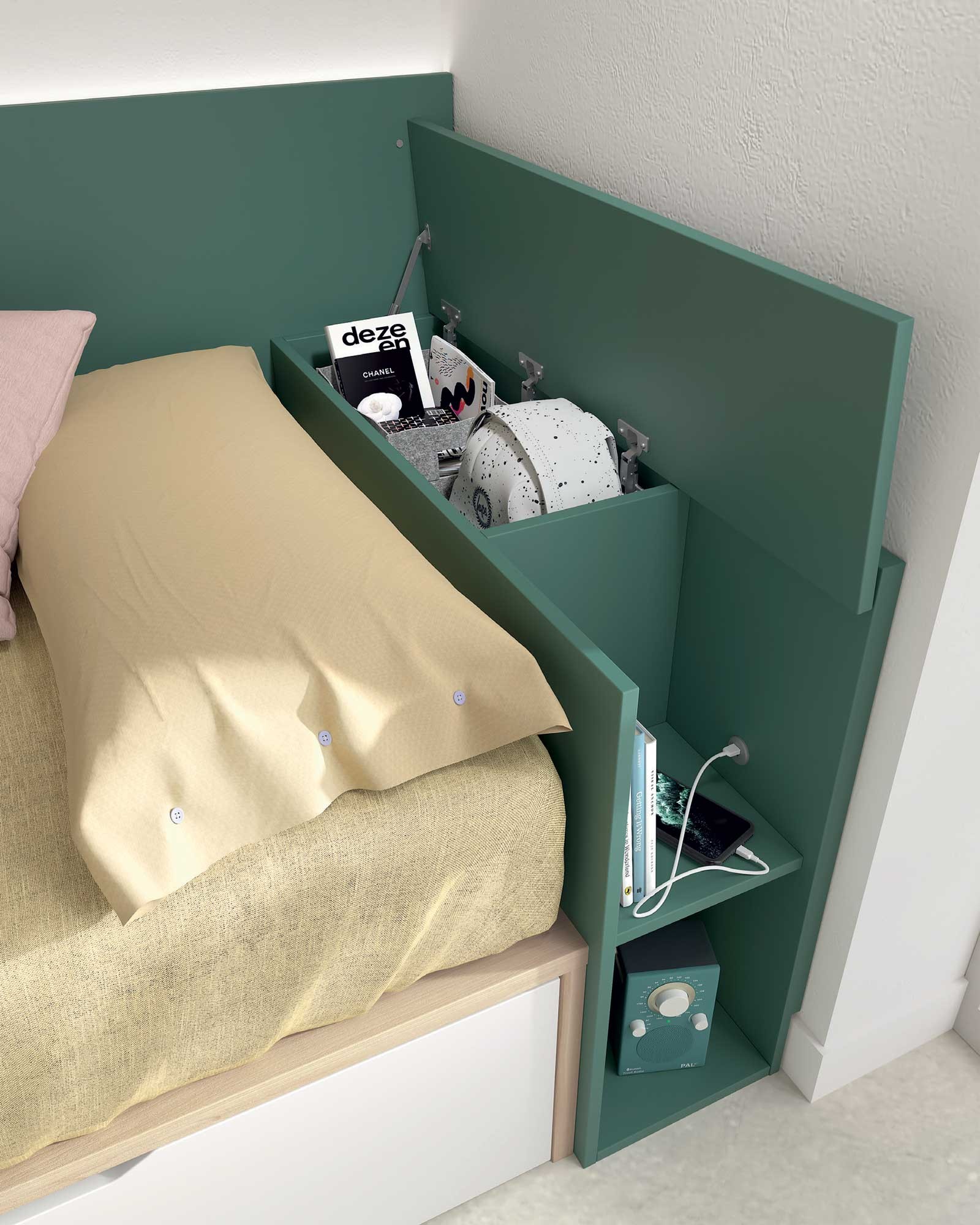 - Un coffre tête de lit avec dessus rabattable