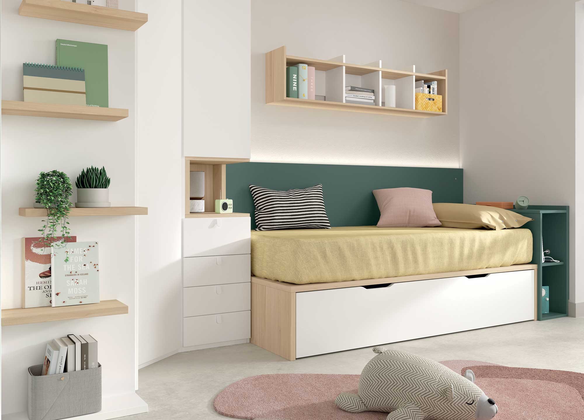 - Une étagère murale au-dessus du lit