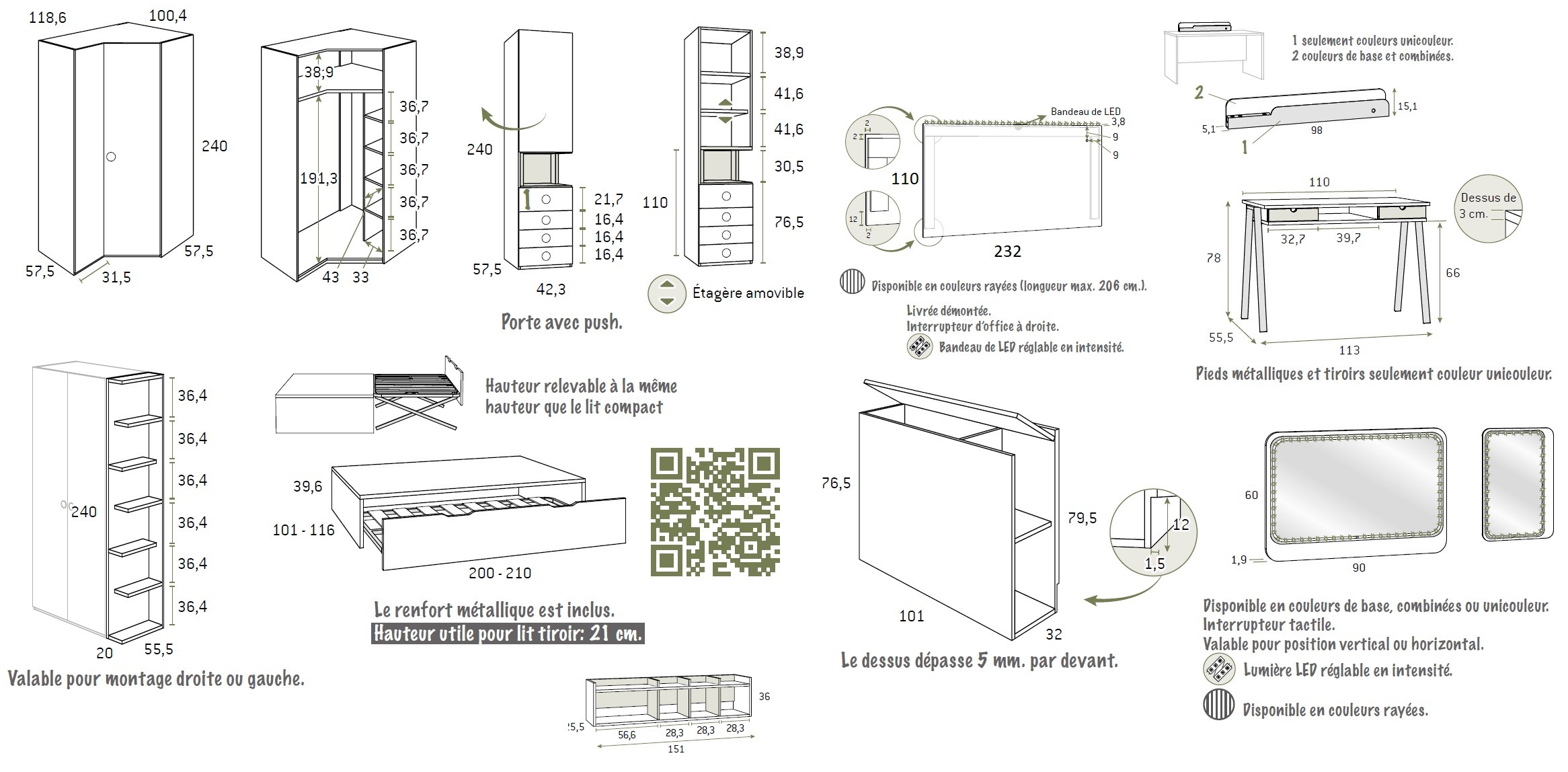 La composition est présentée en coloris, poignées et dimensions: