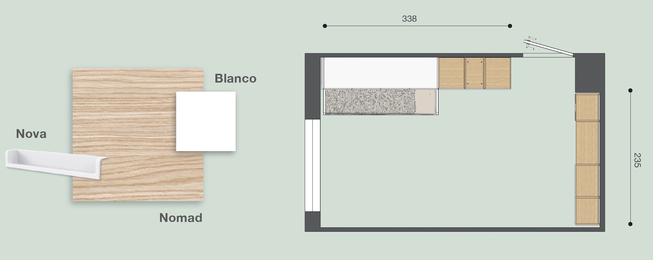 Les dimensions de la composition coté lit L 338 cm et coté bureau L 235 cm