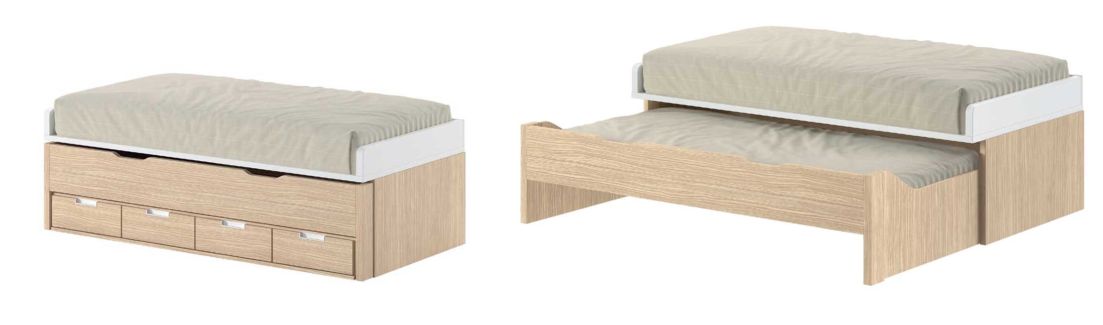 1 tiroir lit gigogne coulissant et relevant sur pieds