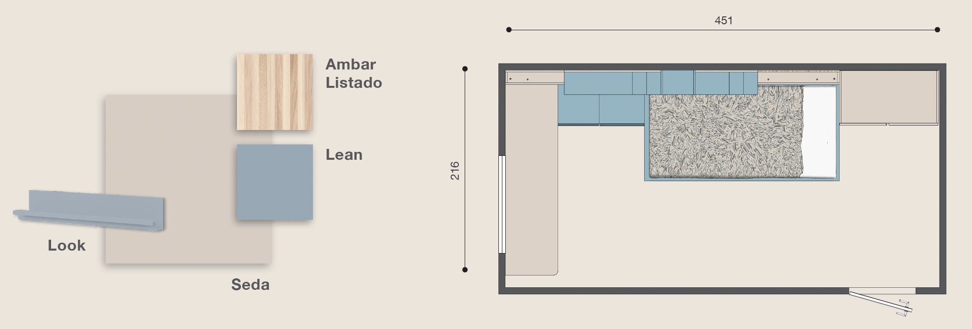 Les dimensions de la composition coté lit L 451 cm et coté bureau L 216 cm
