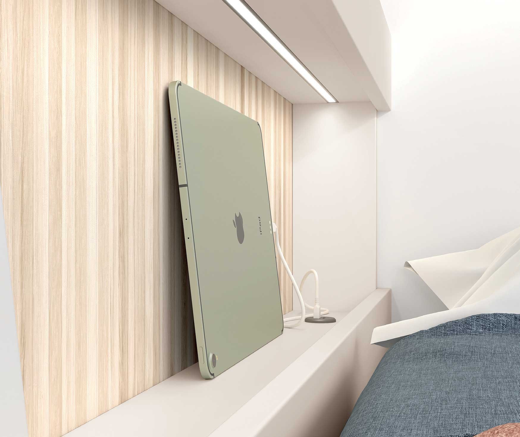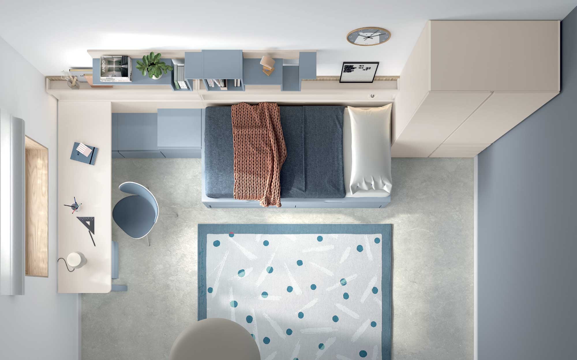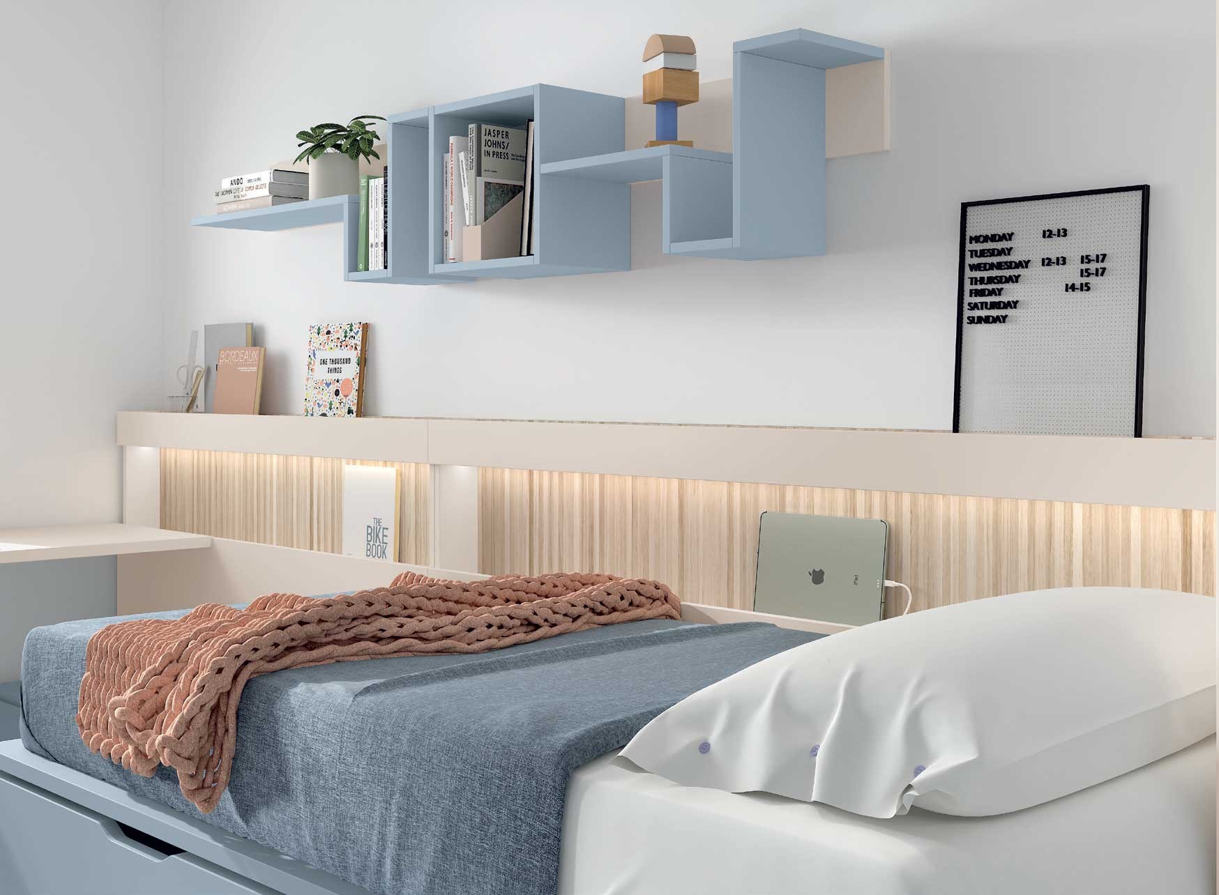 - Un ensemble d'étagères et niche suspendues au-dessus du lit