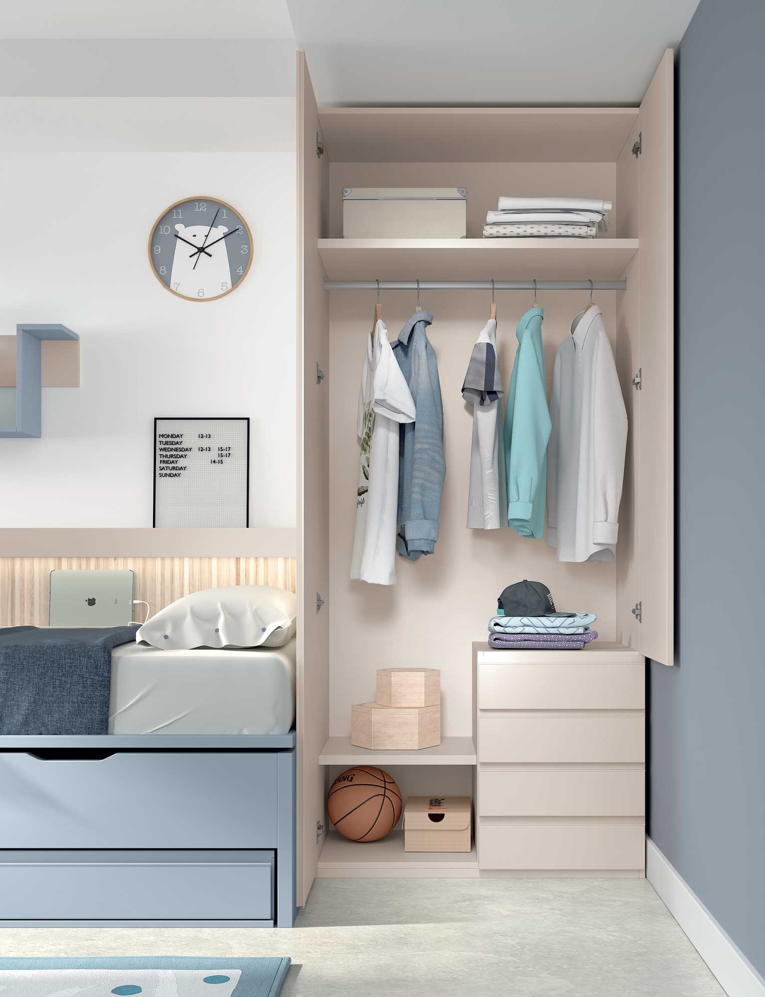 - Une armoire 2 portes + 4 tiroirs à fermeture amortie composée de 2 étagères et 1 barre de penderie