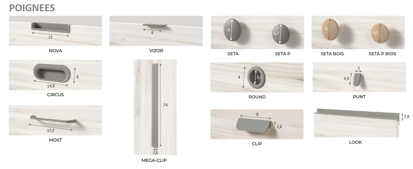 le ou les coloris des façades + le coloris des caissons + la poignée avec son coloris