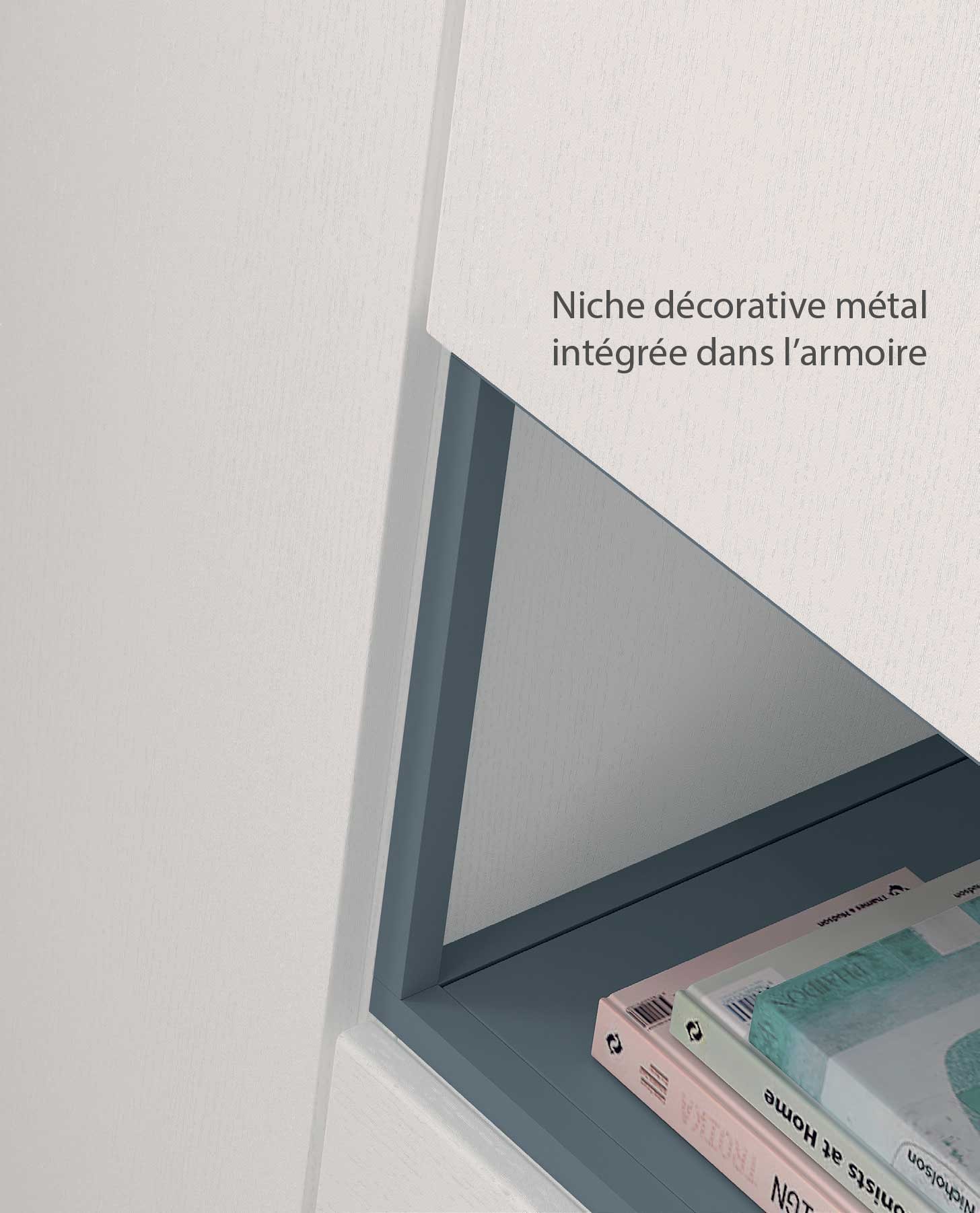 - Une armoire 1 niche décorative avec encadrement métal laqué + 1 porte + 4 tiroirs à fermeture amortie composée de 3 étagères