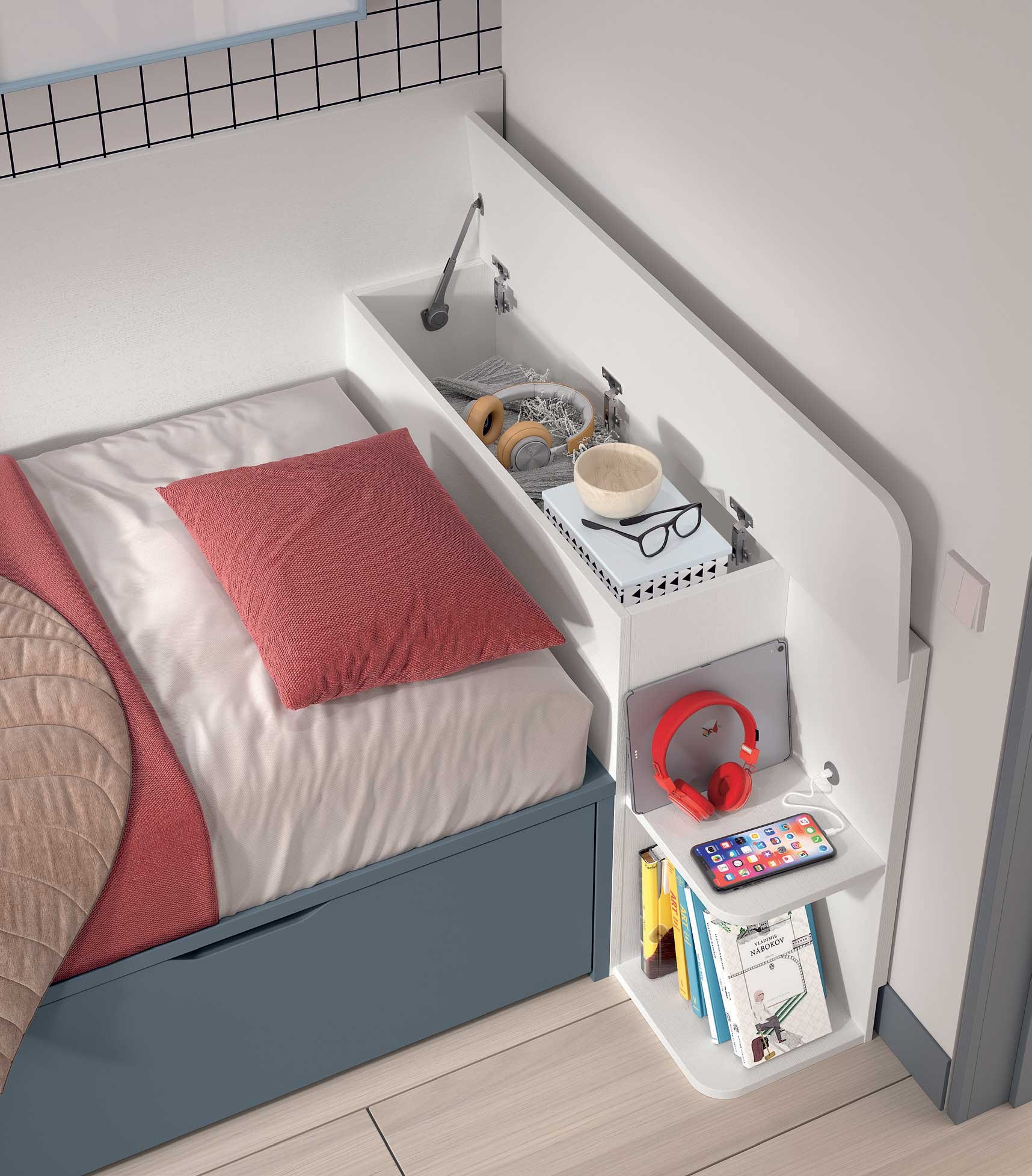 - Une tête de lit avec coffre supérieur à ouverture rabattable et étagères arrondies à droite