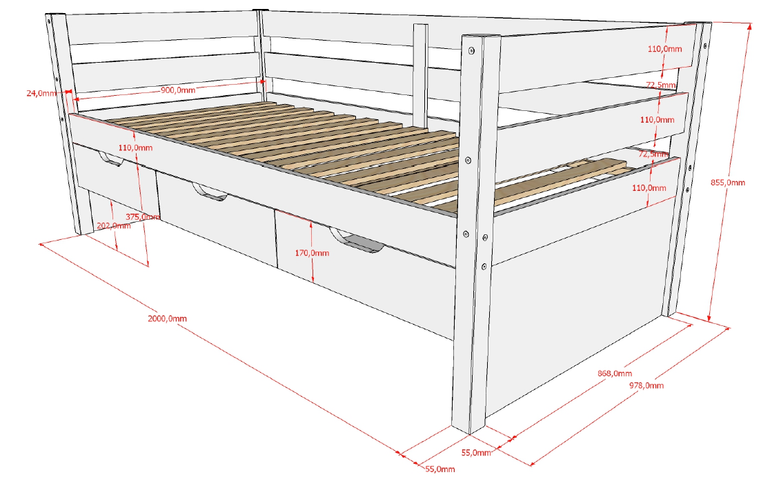 Le lit principal est livré avec un sommier à lattes en bois pour un couchage en 90 x 200 cm, et le lit gigogne a un couchage de 90 x 190 cm pour matelas épaisseur 10cm.