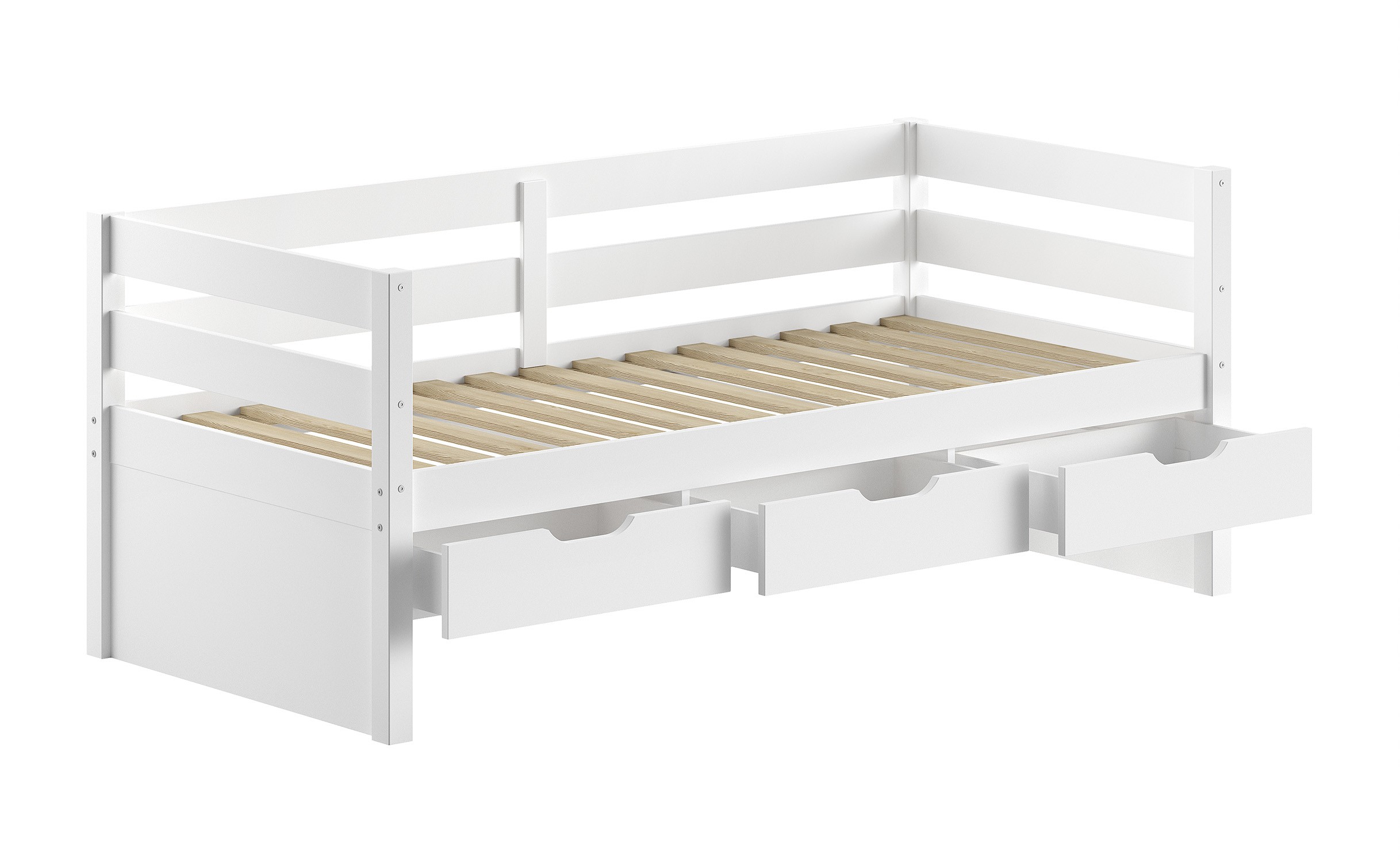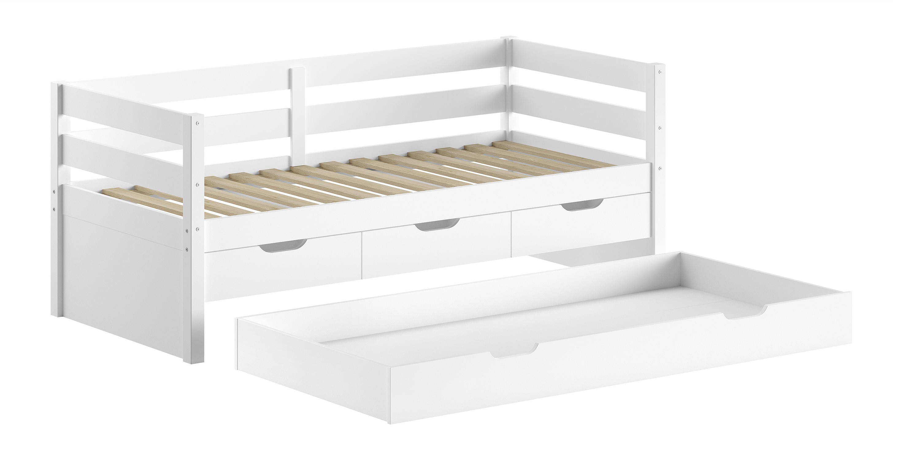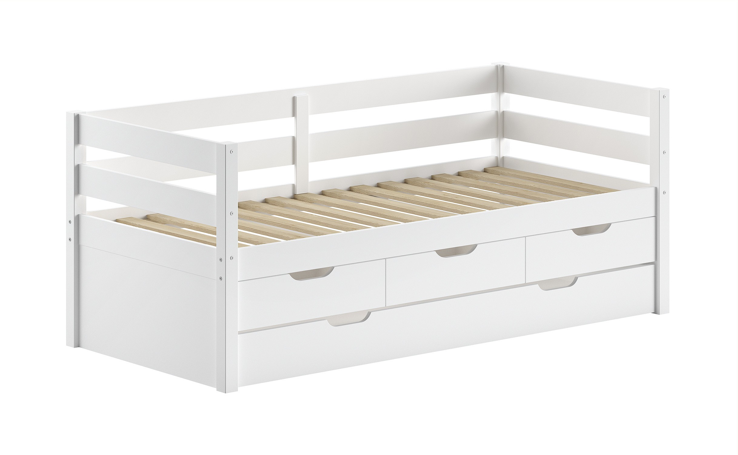 Ce lit avec rangement est fabriqué en pin massif FSC, finition laqué blanc satiné.