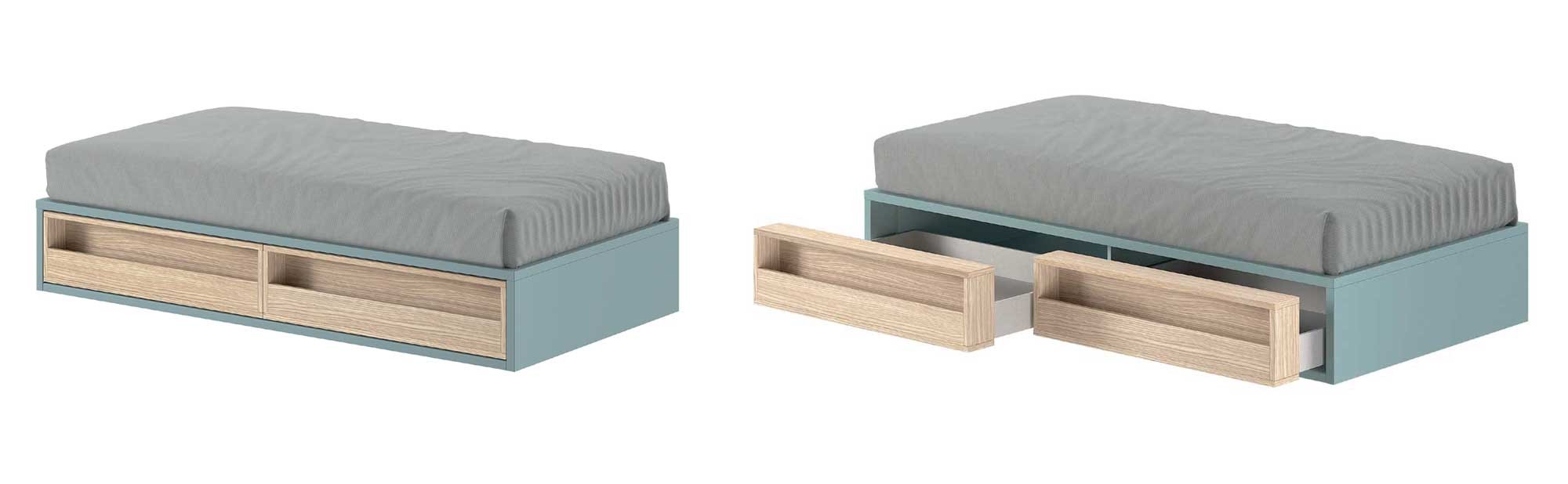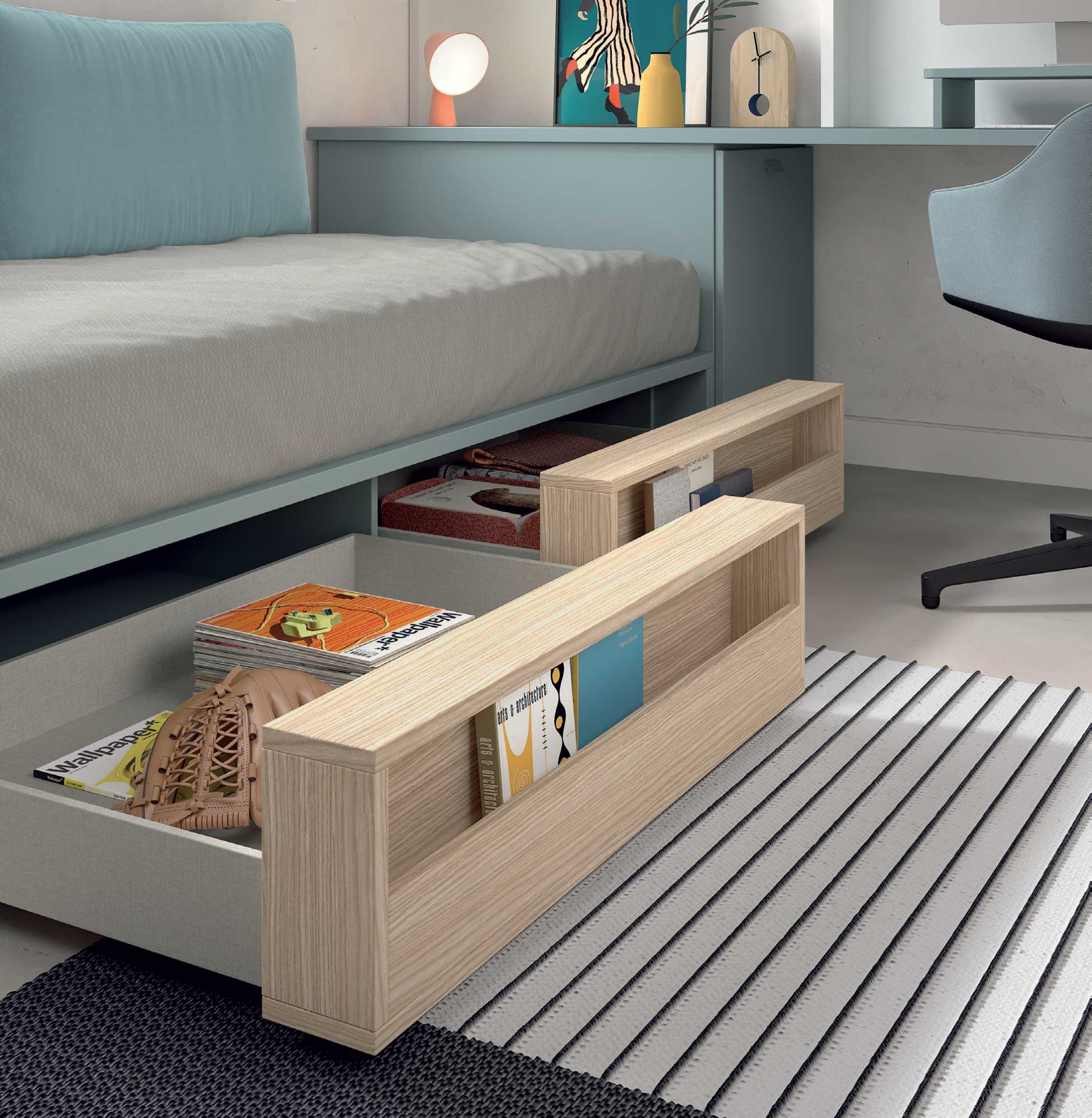 - Lit banquette avec couchage 90 x 190 cm avec renfort en métal inclus composé de 2 tiroirs avec bibliothèque avant et fermeture amortie