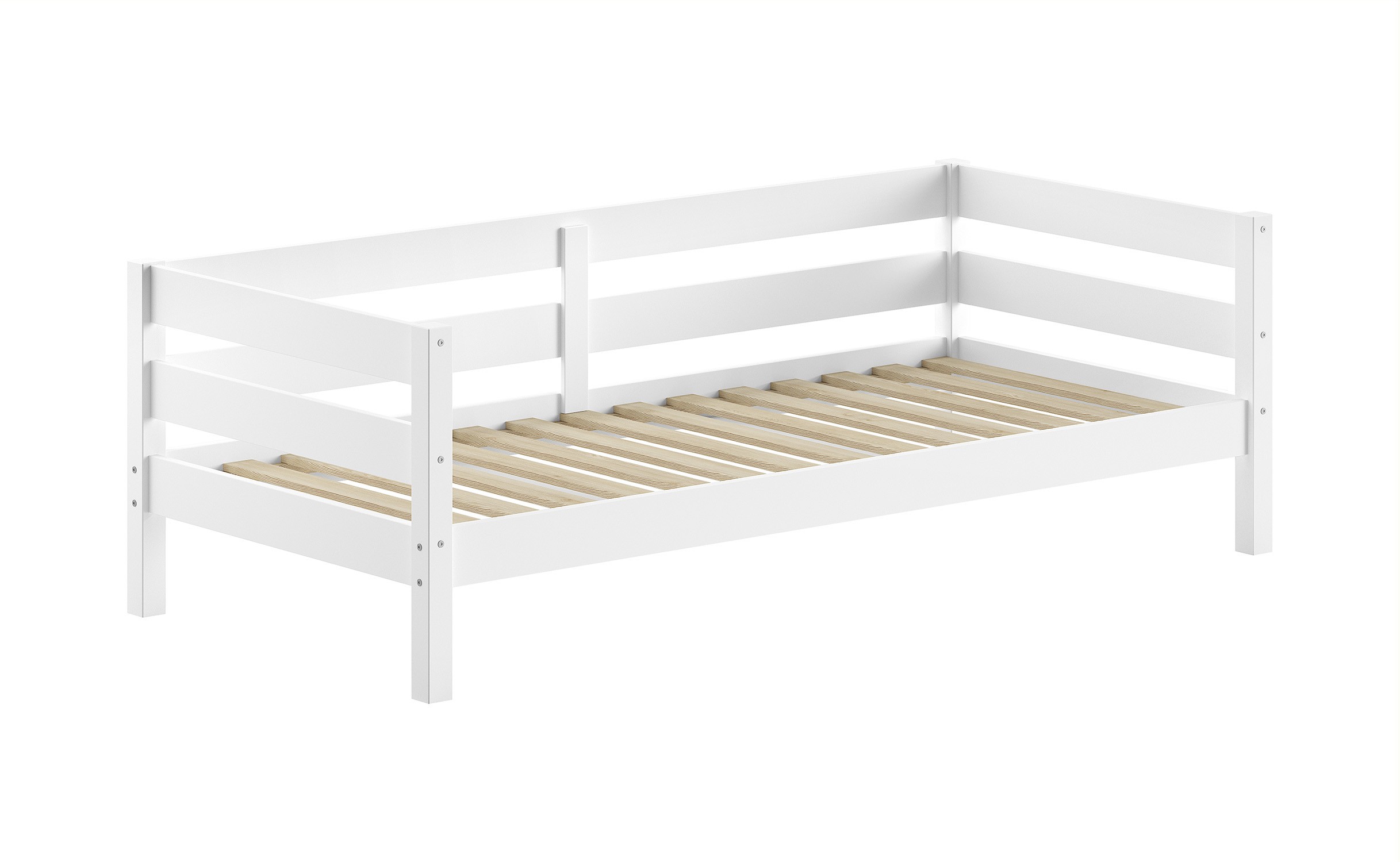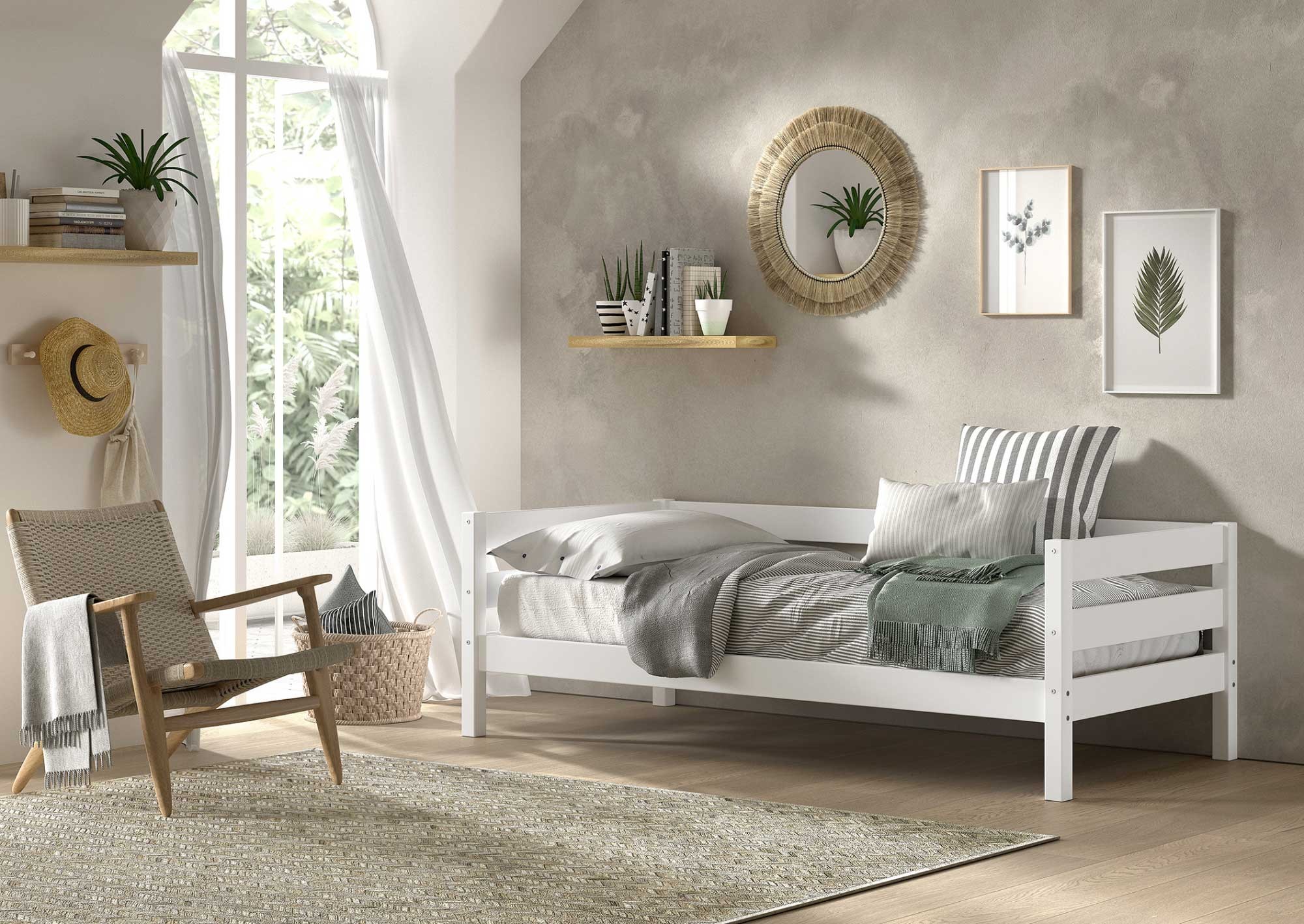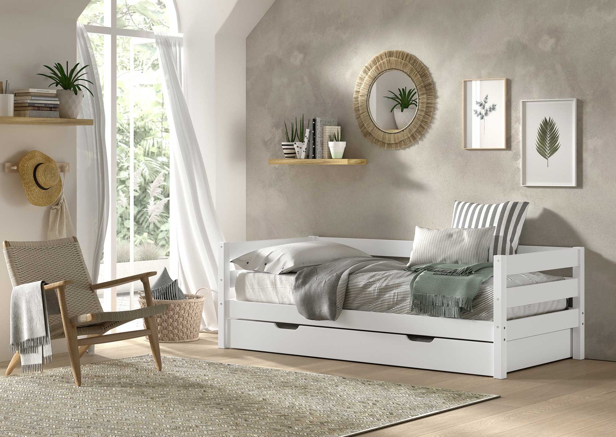 Le lit banquette est livré avec un sommier à lattes en bois pour un couchage en 90 x 200 cm.
