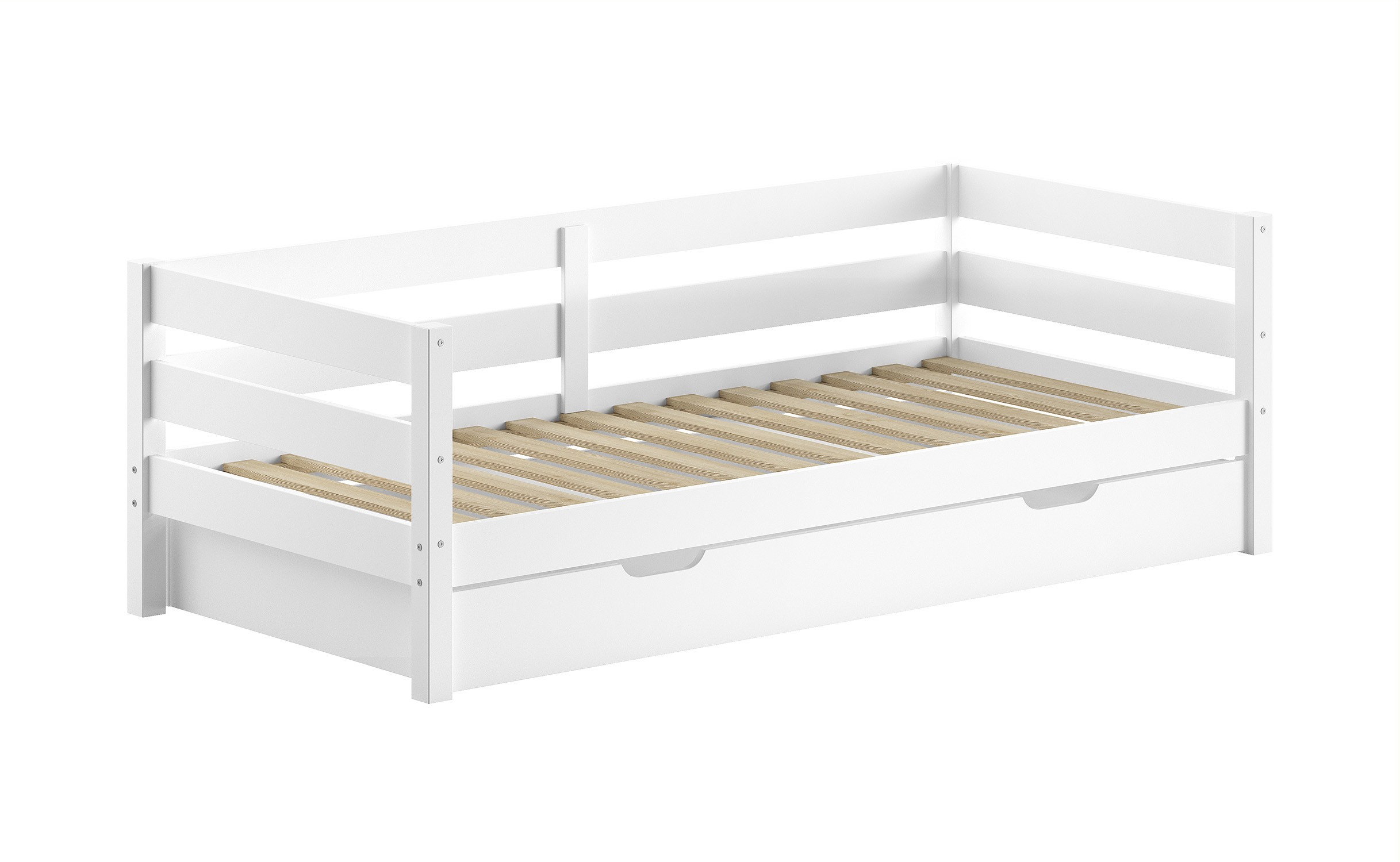 Ce lit avec rangement est fabriqué en pin massif FSC, finition laqué blanc satiné.