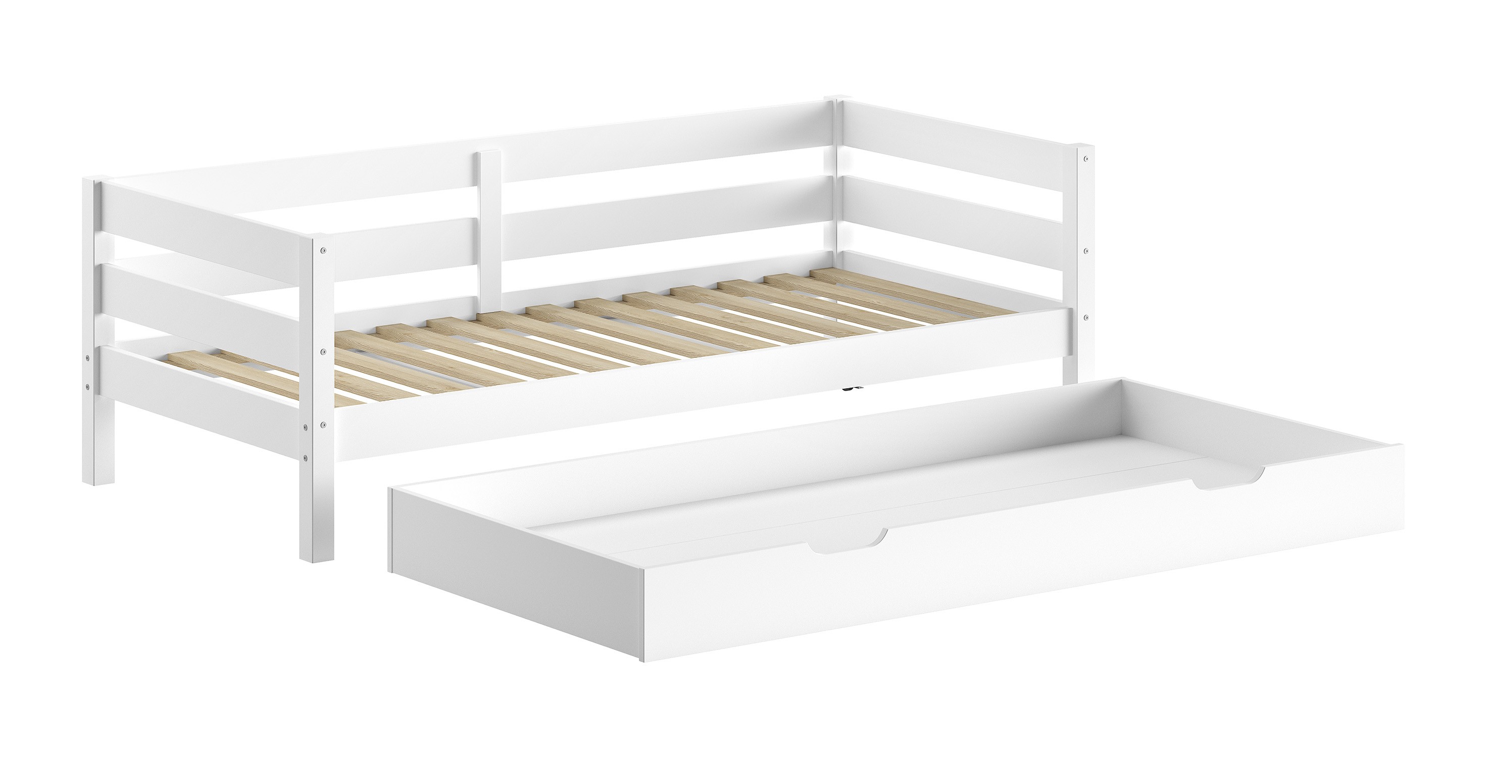 Ce lit avec rangement est fabriqué en pin massif FSC, finition laqué blanc satiné.