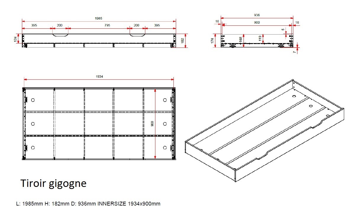 Peut s'accessoiriser d'un large tiroir sur roulettes au sol, qui peut servir de grand rangement ou de lit gigogne en y insérant un matelas épaisseur 10 cm.