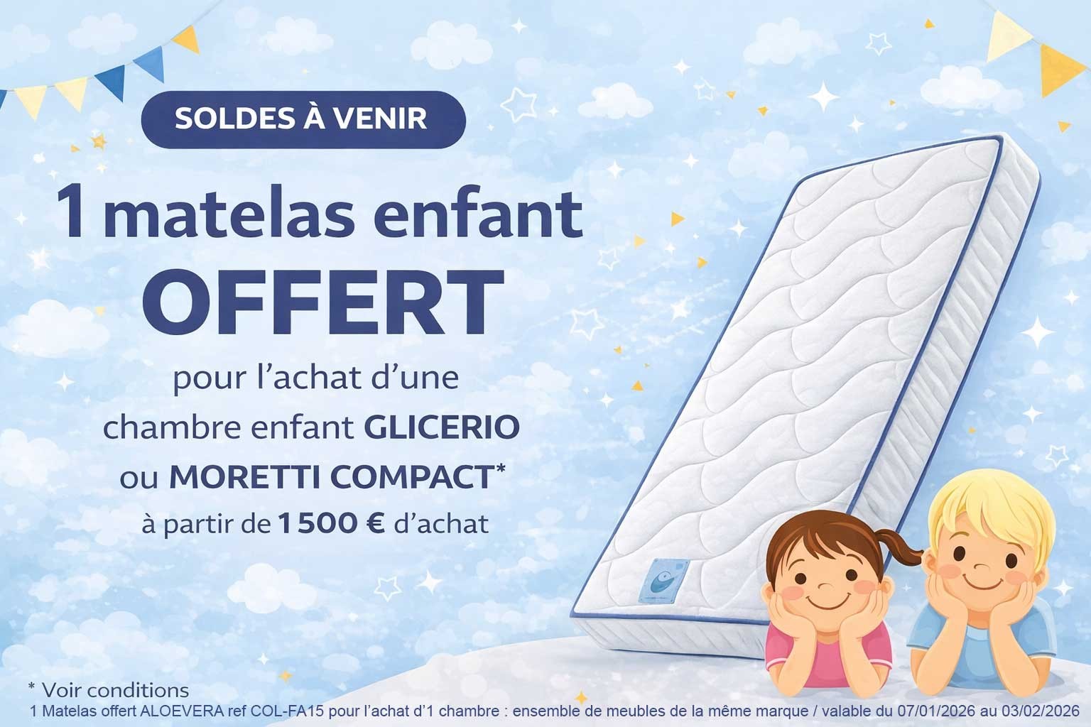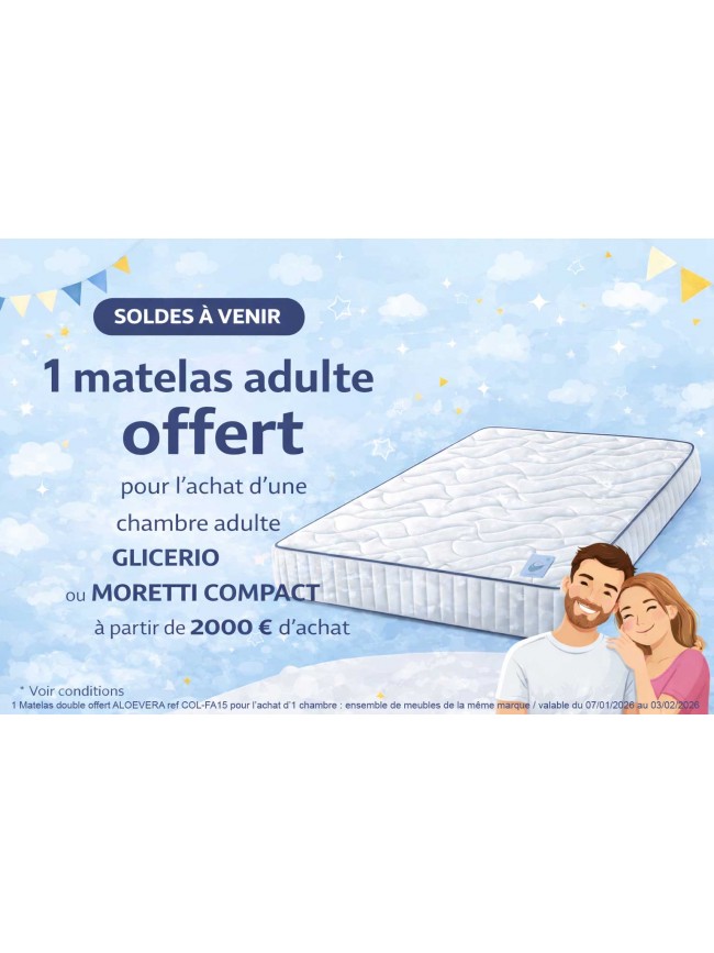 nous offrons un matelas enfant pour tout achat de chambre complète ( ensemble de meubles d'une même marque avec minimum d'achat de 1 500 euros) valable dans les marques GLICERIO ou MORETTI COMPACT.