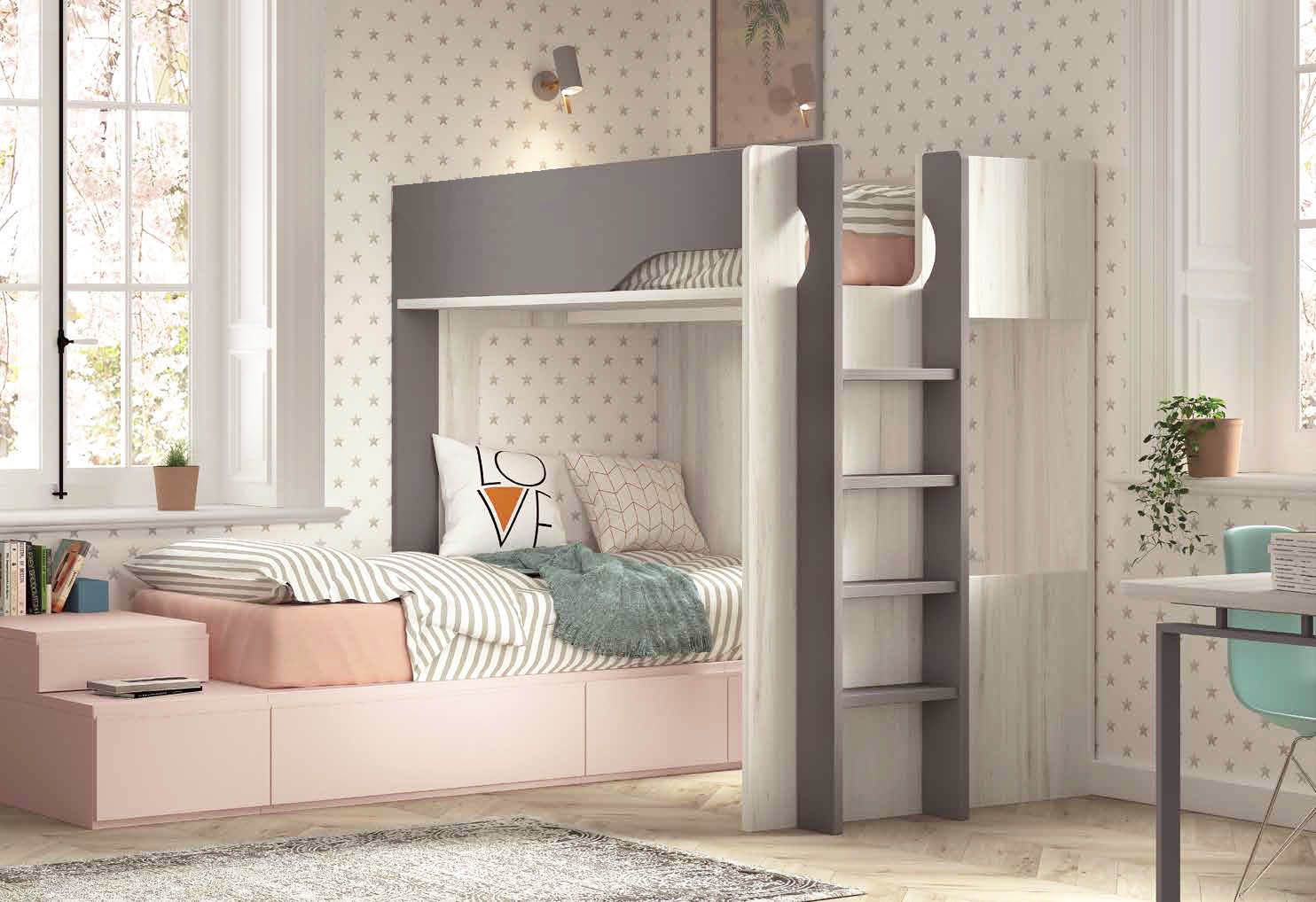 À l’adolescence, l’intégration d’un espace de travail devient essentielle. Certains lits superposés permettent d’intégrer un bureau directement sous ou à côté du couchage.