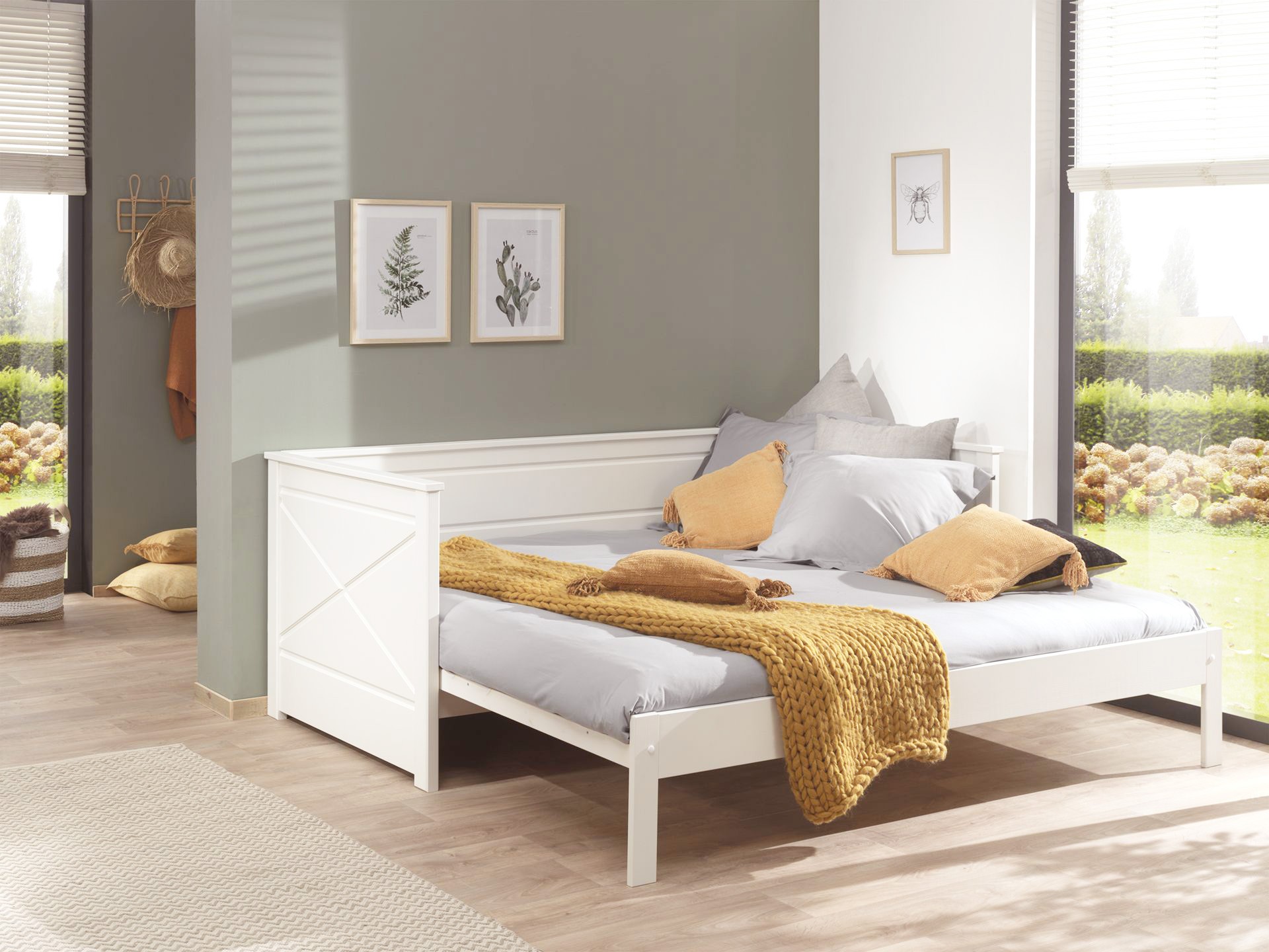 Le lit canapé convertible en bois massif HARRY a une finition en laque anti-UV (non jaunissante) coloris Blanc