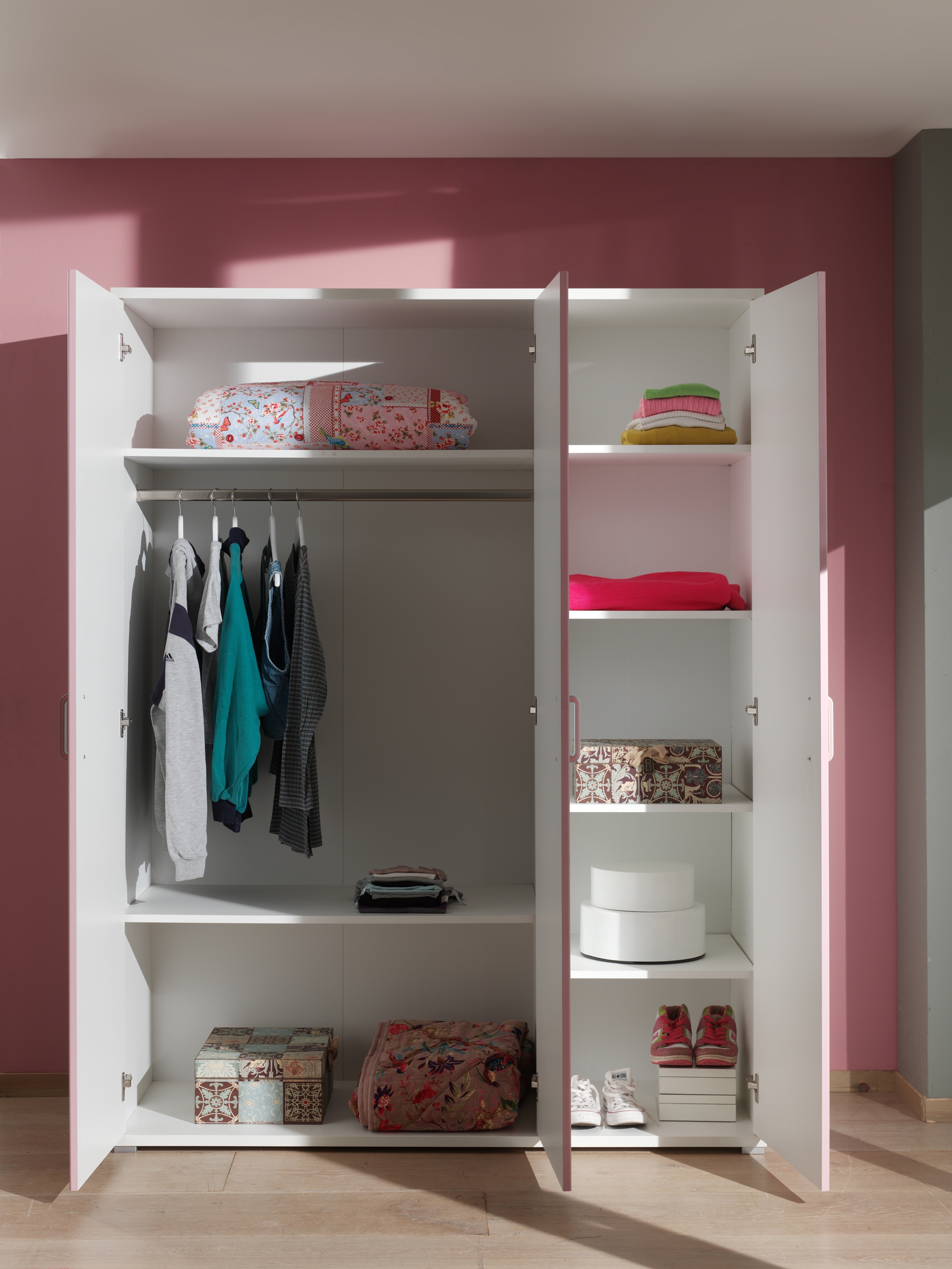 l'armoire 3 portes EMILIE en bois MDF recouvert d'une laque à l'eau coloris blanc, composée de 6 étagères et 1 barre de penderie, Référence AMKL1314 |