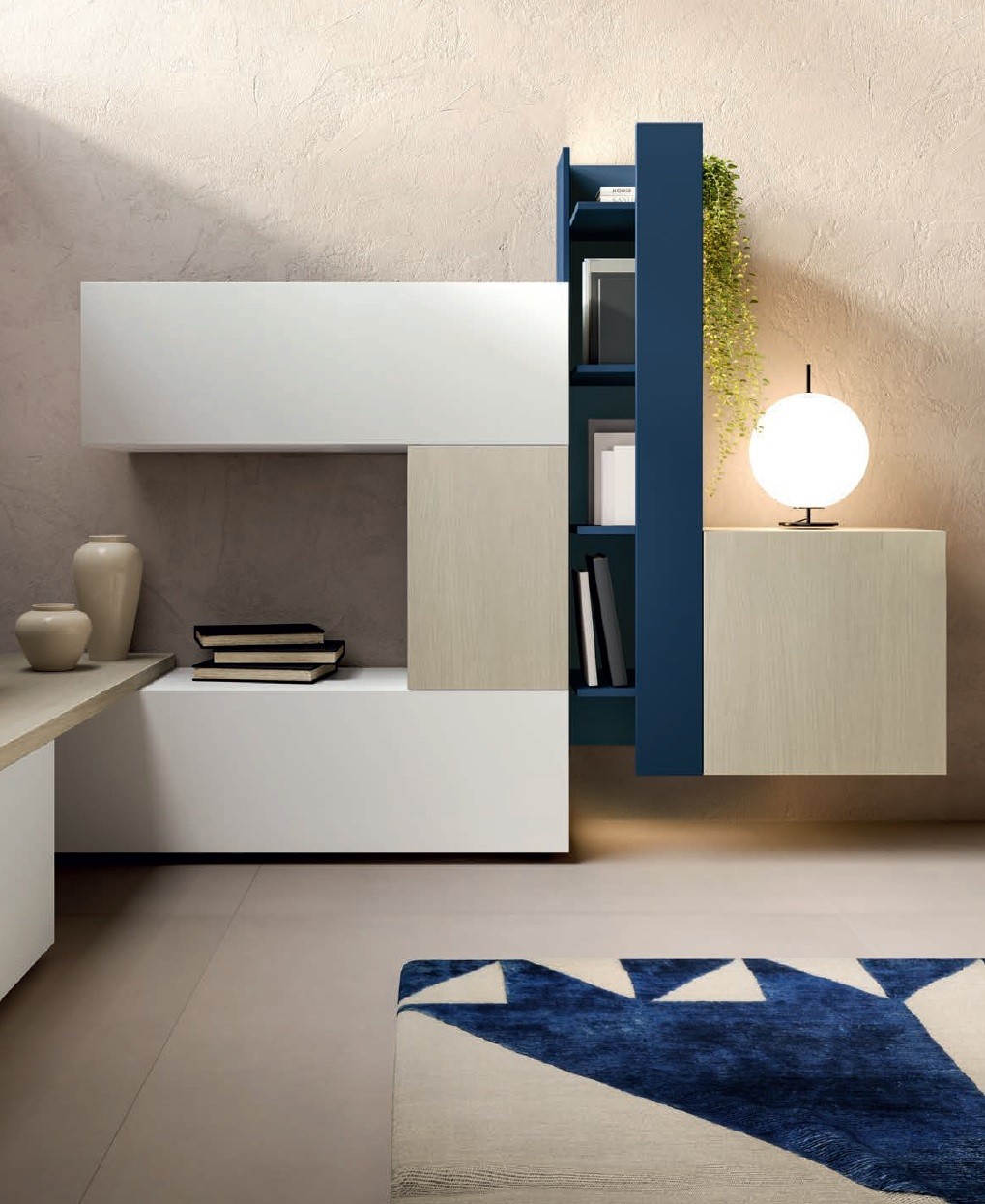 Le meuble TV suspendu moderne et original avec son élément bibliothèque asymétrique d'un bleu profond, alliance du design et de la fonctionnalité