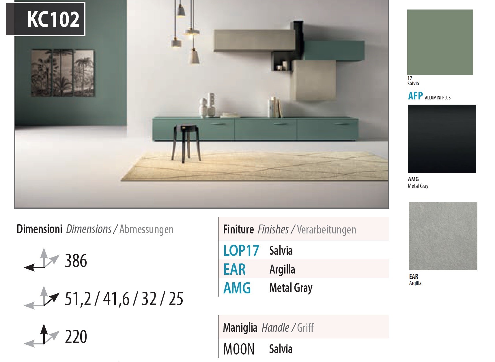 Présenté en finitions : laque mate coloris vert SALVIA + mélaminé aspect Ciment coloris Argilla + aluminium coloris métal Gray