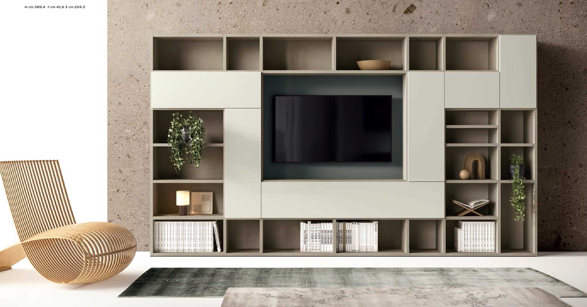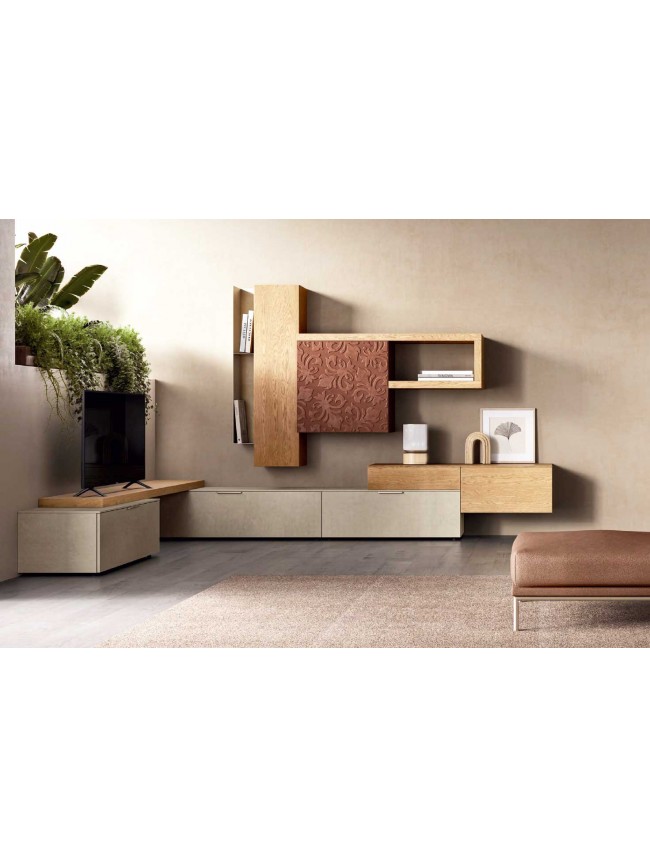 Meuble TV moderne asymétrique avec bibliothèque design italien PERSONNALISABLE KL214 avec un jeu de de niches ouvertes et fermées pour un effet chic
