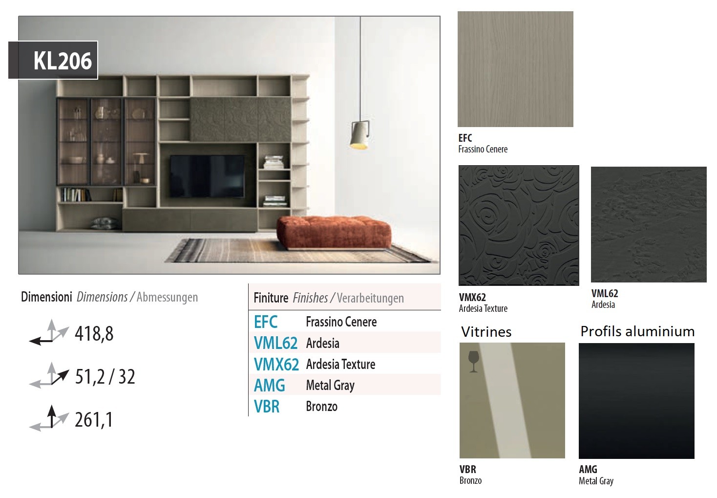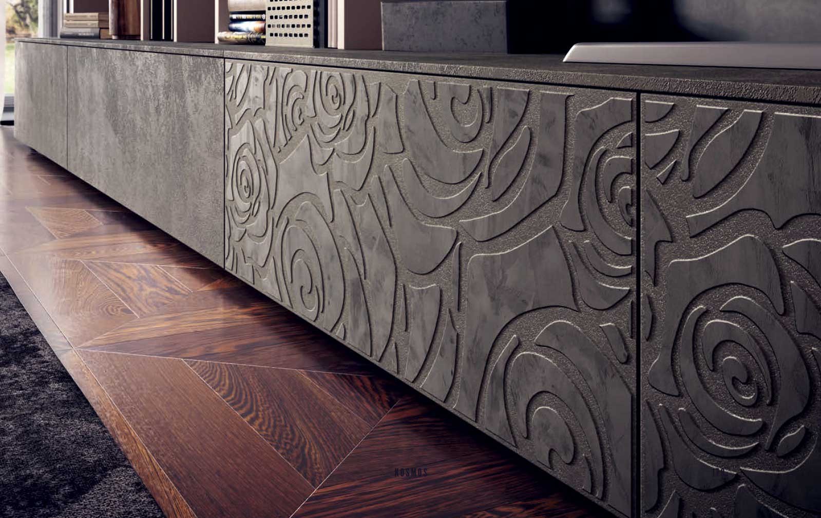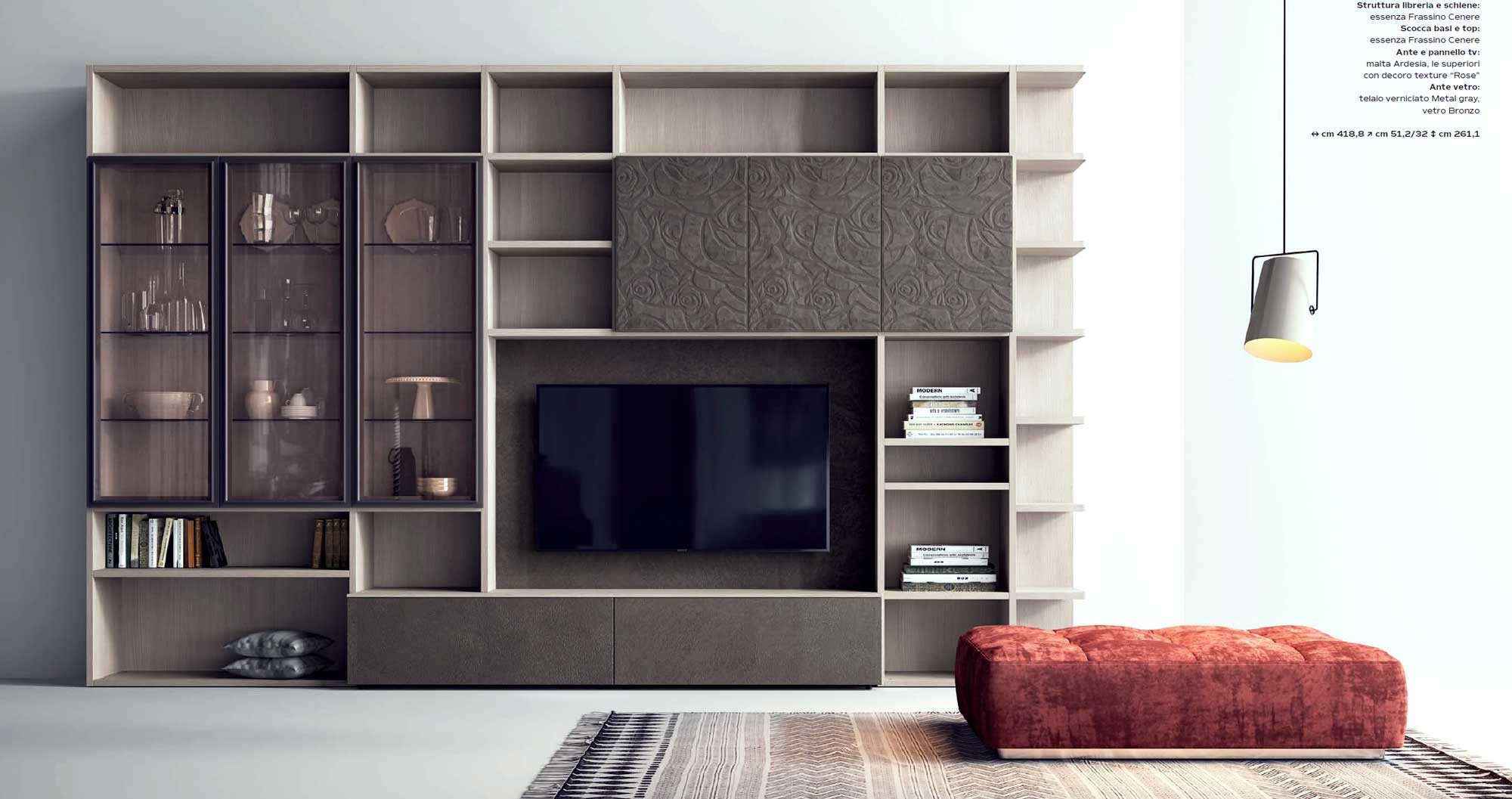 Le meuble TV moderne asymétrique est original avec ses éléments qui jouent sur les lignes, en finition bois Frassino Cenere + façades texturé aspect ciment Ardesia lisse et décor ROSE + façades vitrées en Bronzo et profils en métal Gray, alliance du design et de la fonctionnalité